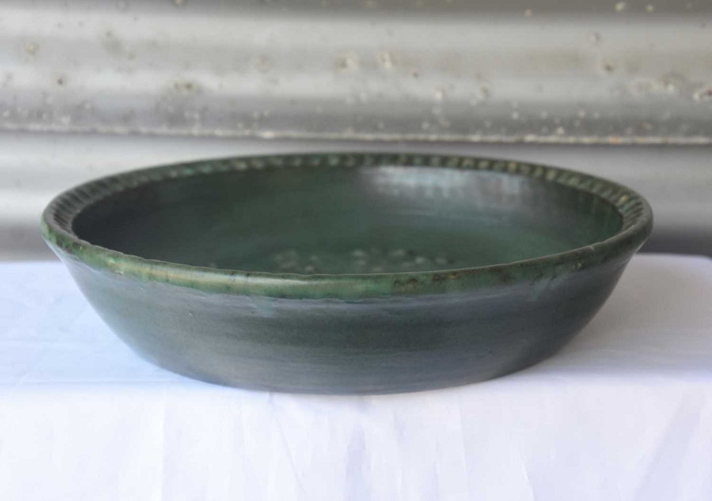 Grønt keramik fad, med blomstrer lignende figur i bunden