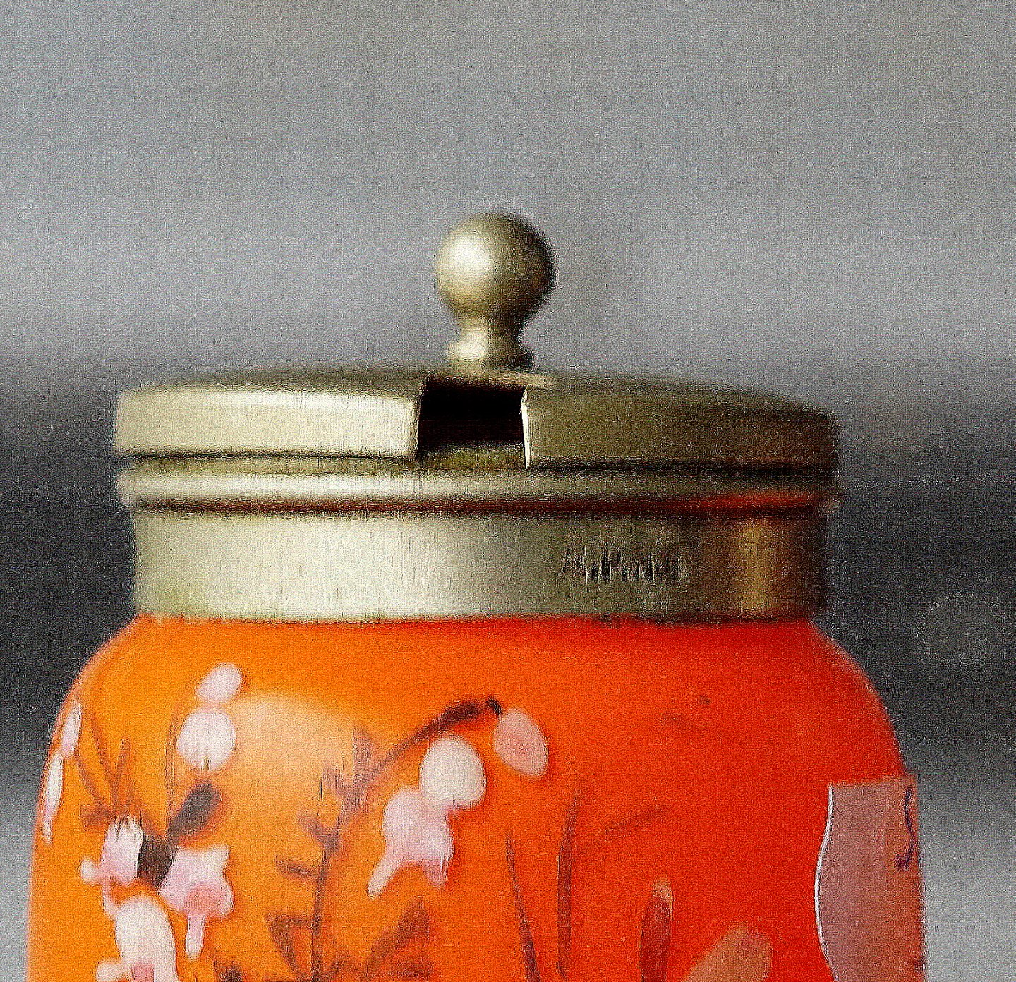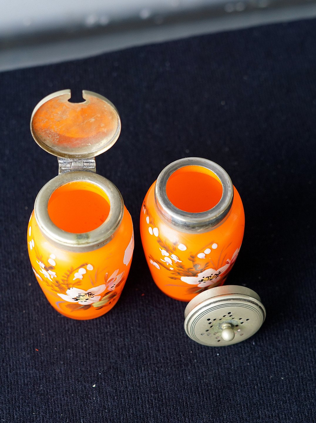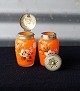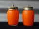 Sennepskrukke og strødåse i orange glas, bemalet med hvide blomster