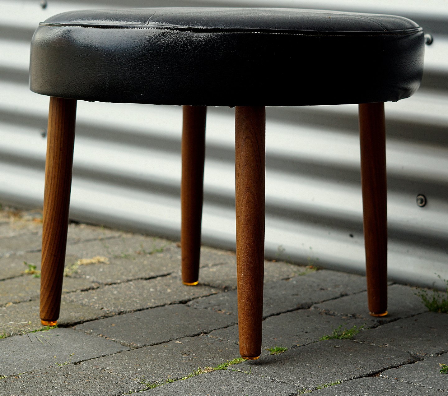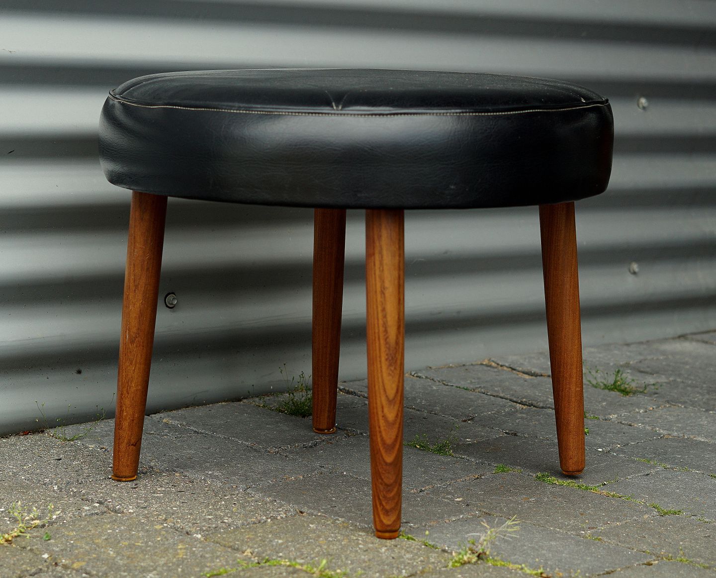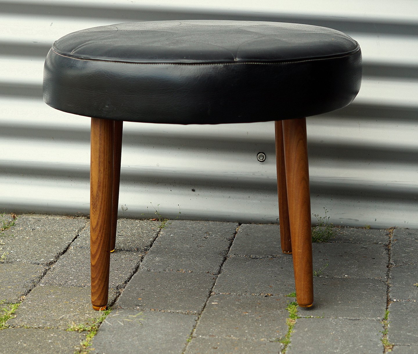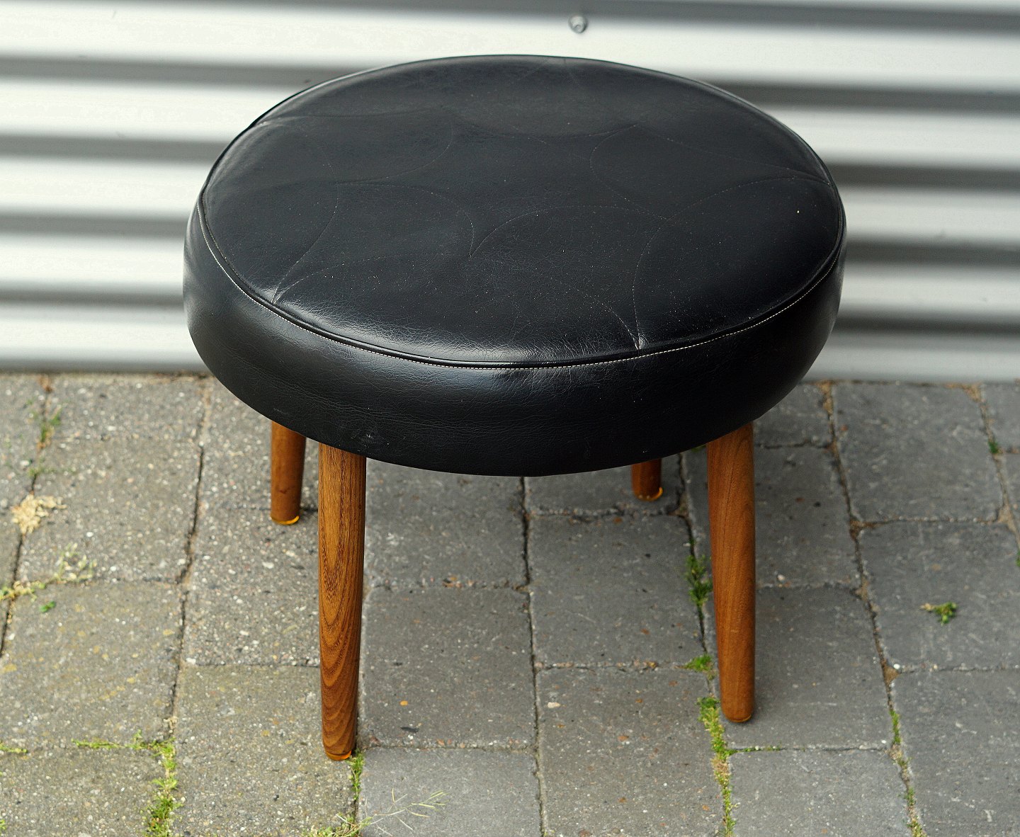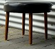 Rund fodskammel med runde teaktræ ben, betrukket med skai.
