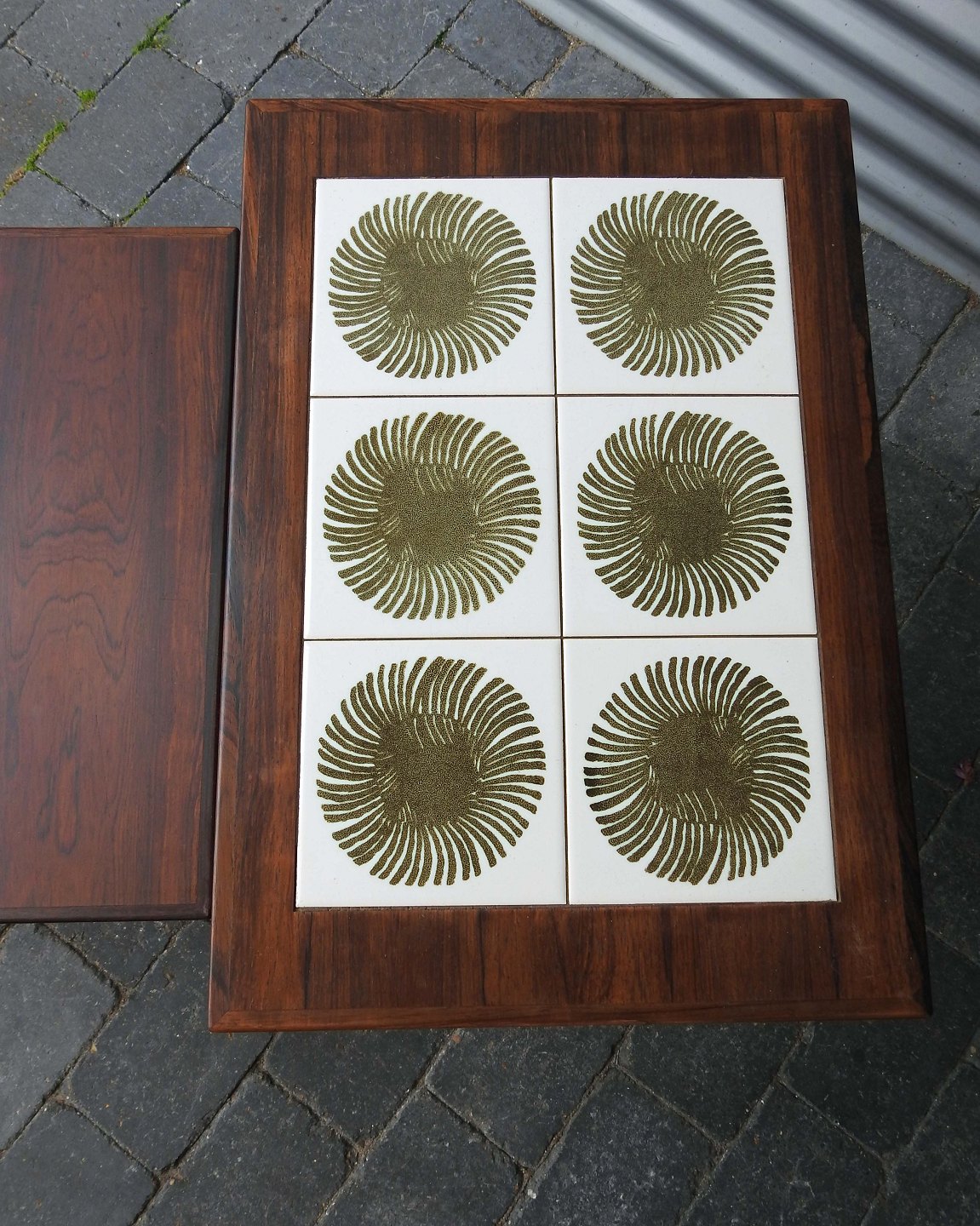 Et sæt indskudsborde i palisander med Royal Copenhagen kakler på øverste topplade