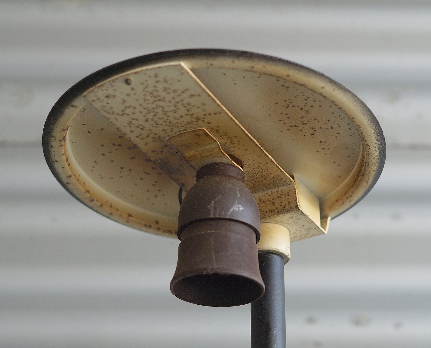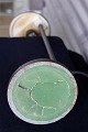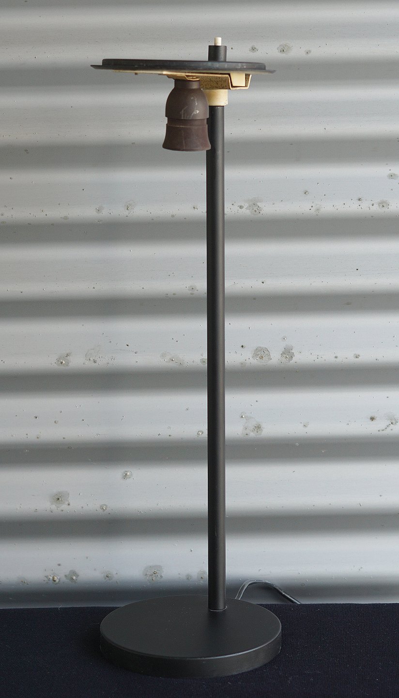 Bordlampe med stålskærm, skærmen er aftagelig. Lampefoden er mat sort lakeret, skærmen er børstet stål