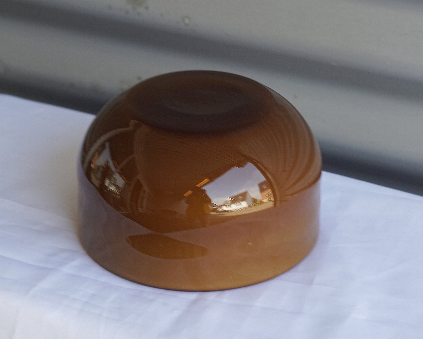 Paletskål i farven Umbra, blev lavet mellem 1969 og 197. Skålen blev produceret på Fyensglasværk for Holmegaard Glasværk