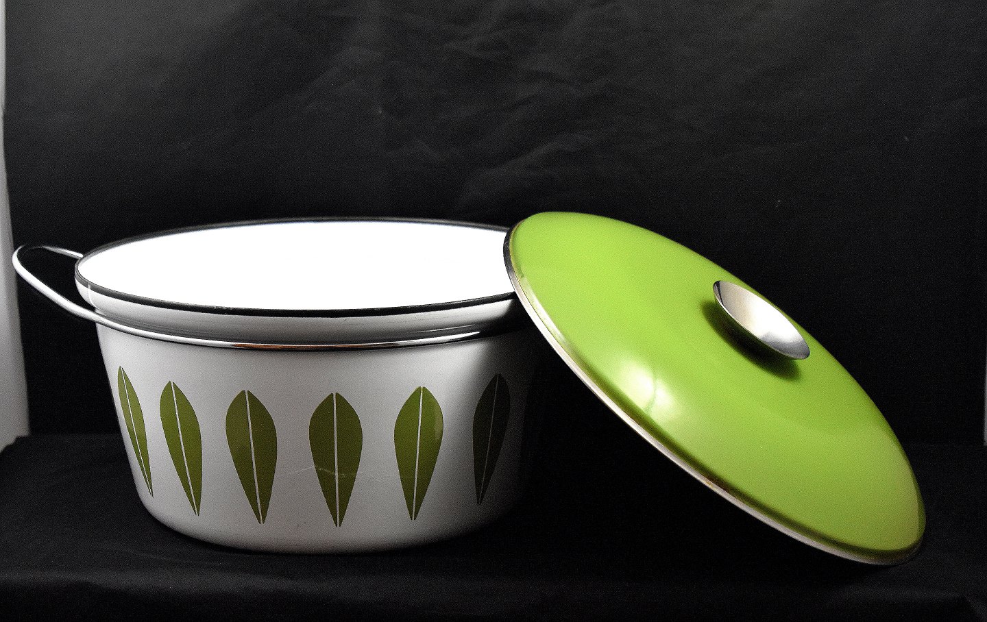 Lotusgryde med limegrønne blade og limegrønt låg. Gryden er emaljeret