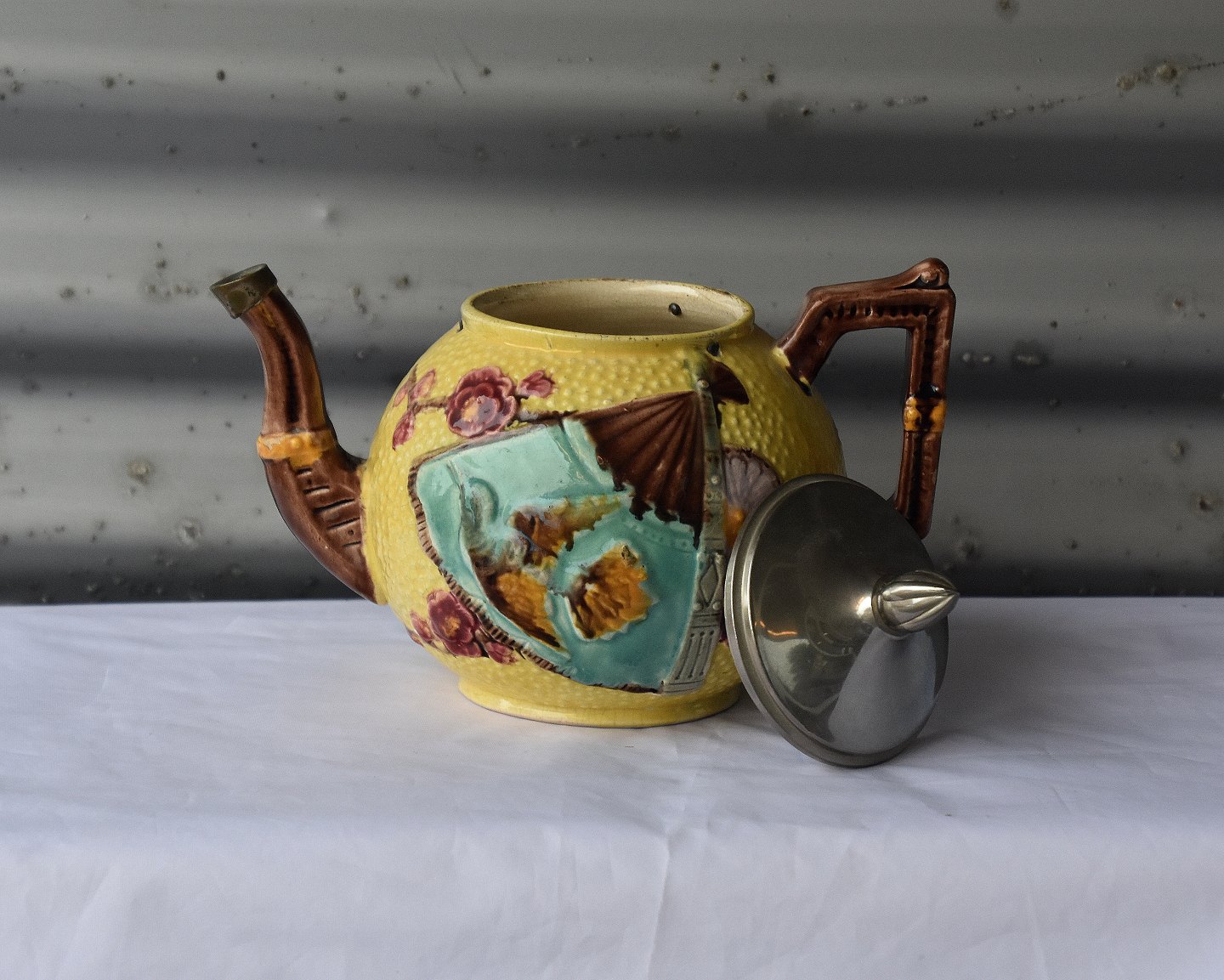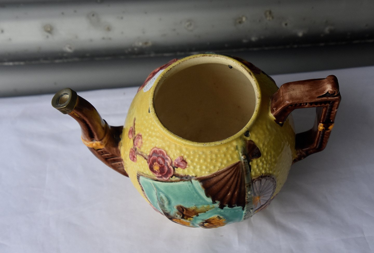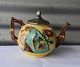 Gul tekande i keramik dekoreret med vifte og blomster, med metal låg