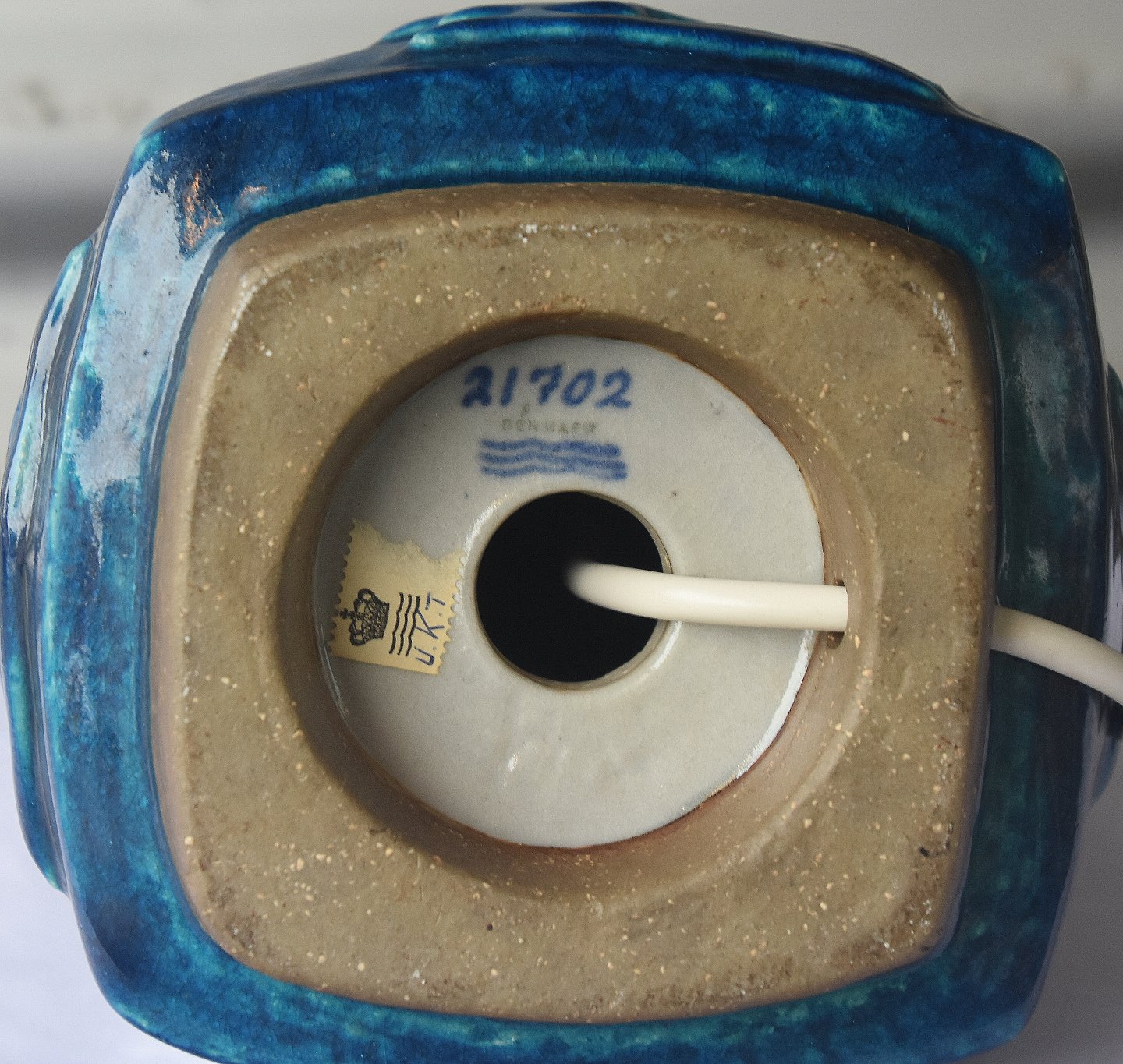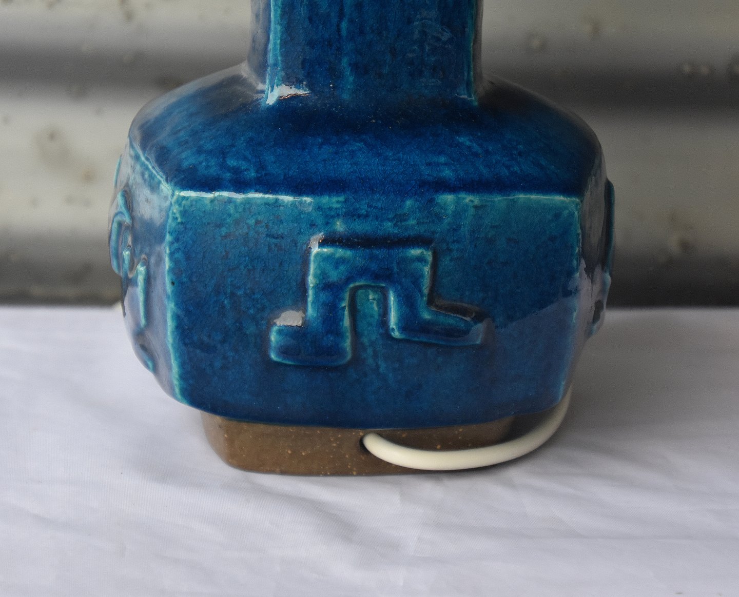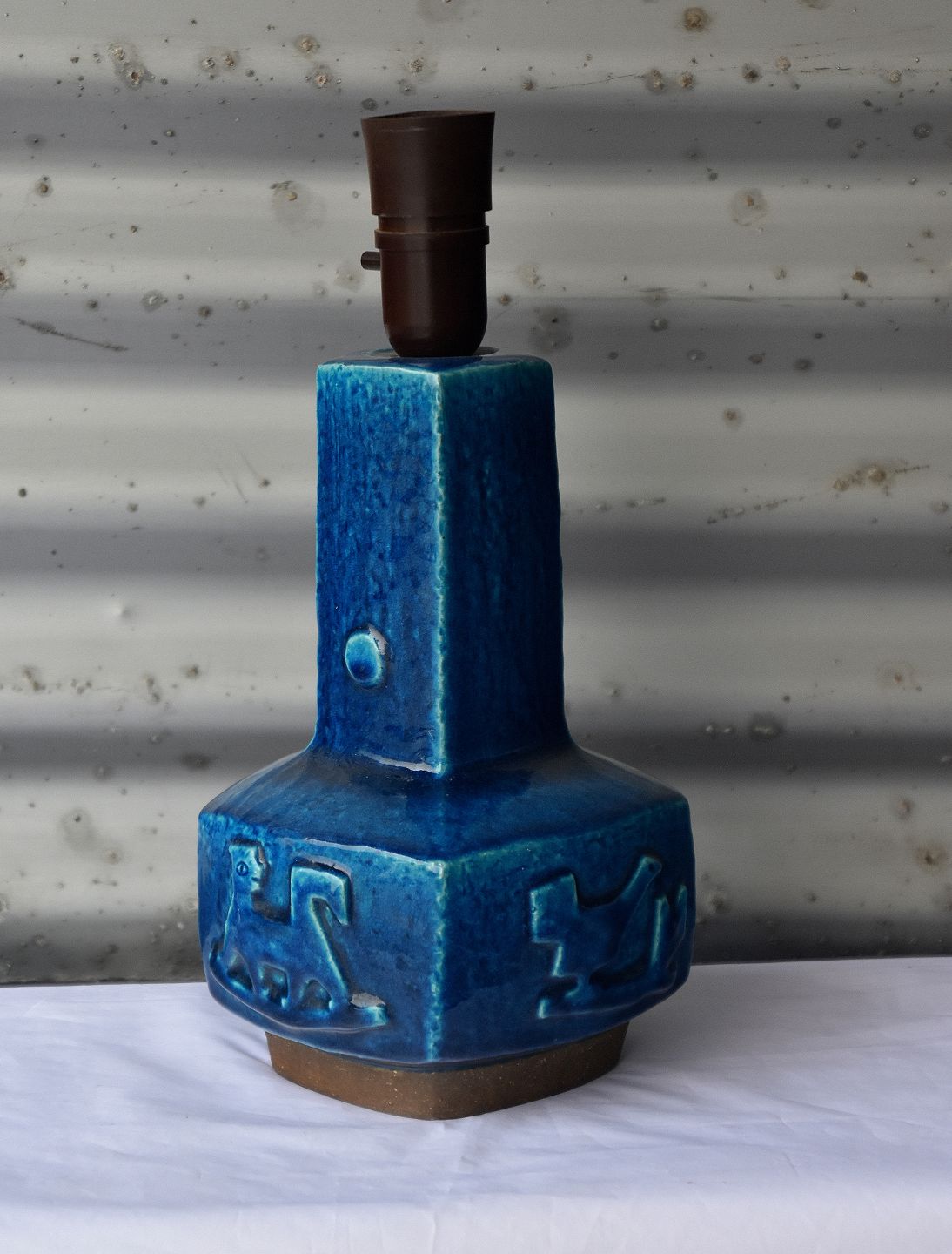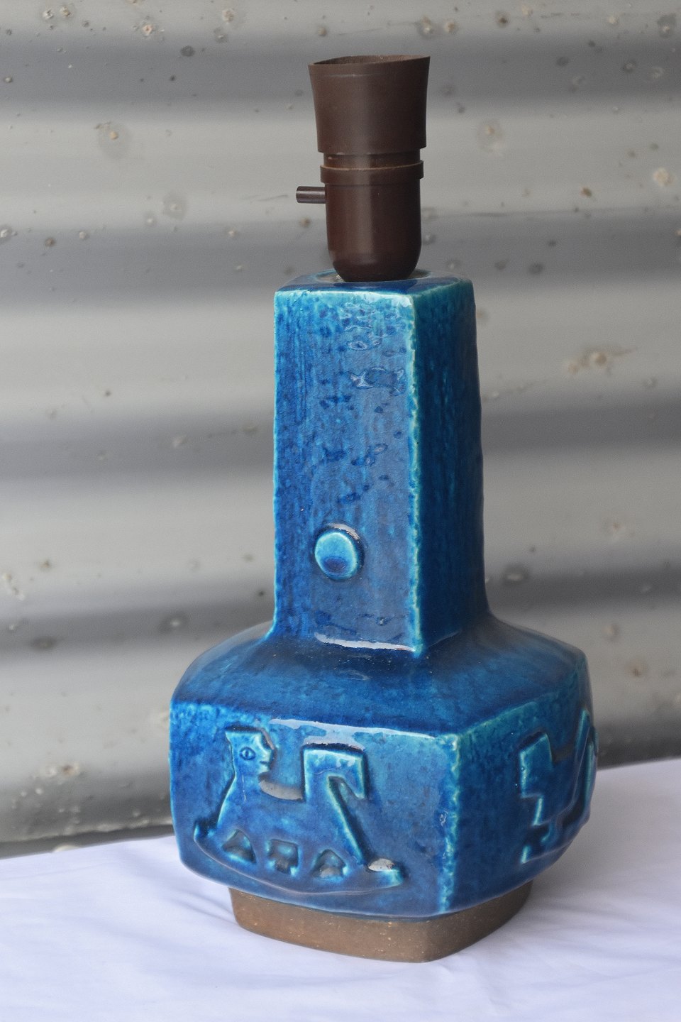 Bordlampe nr. 21702, 4sidets stentøjs lampe fod med fugle og dyr. Lampen er med blåt glasur