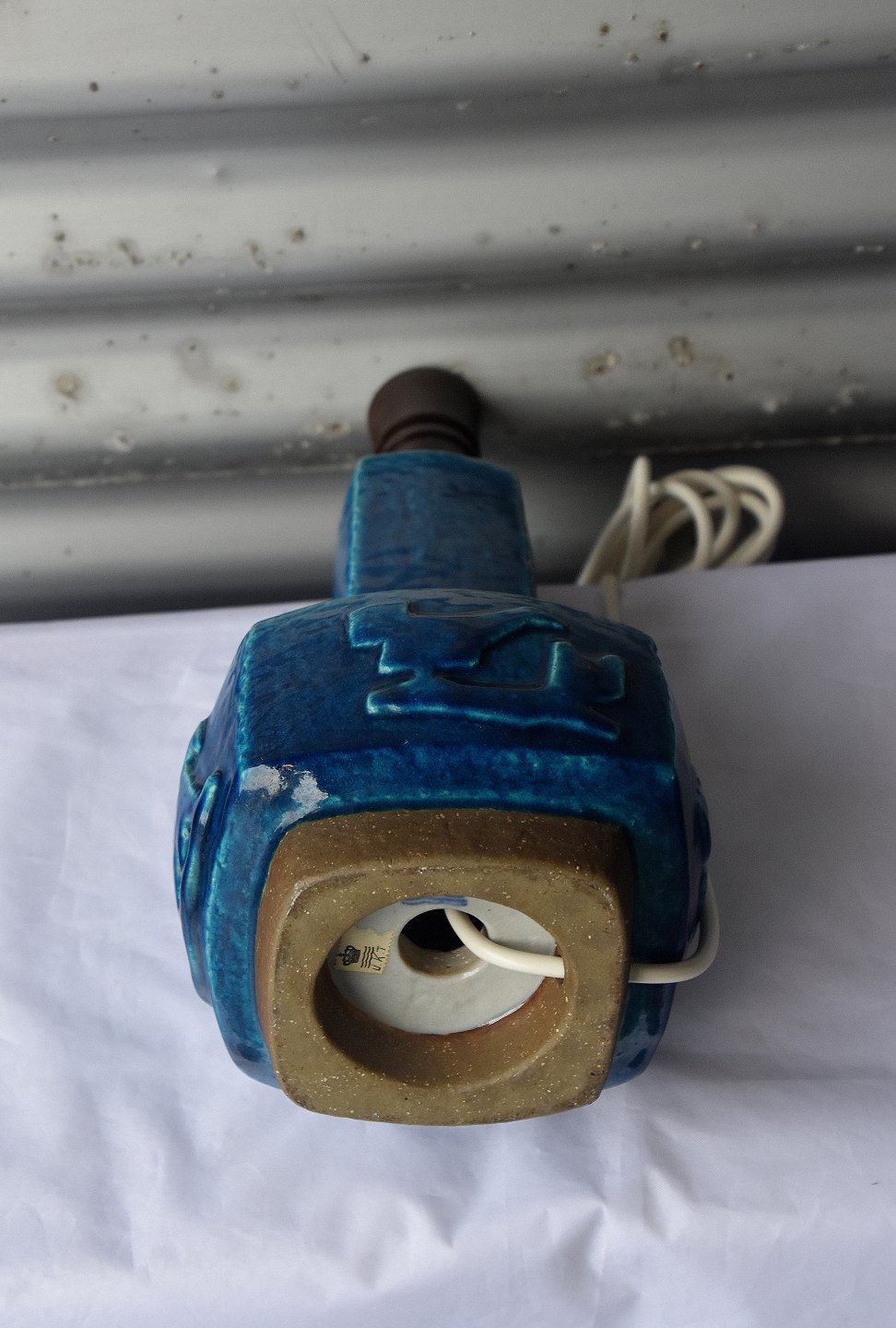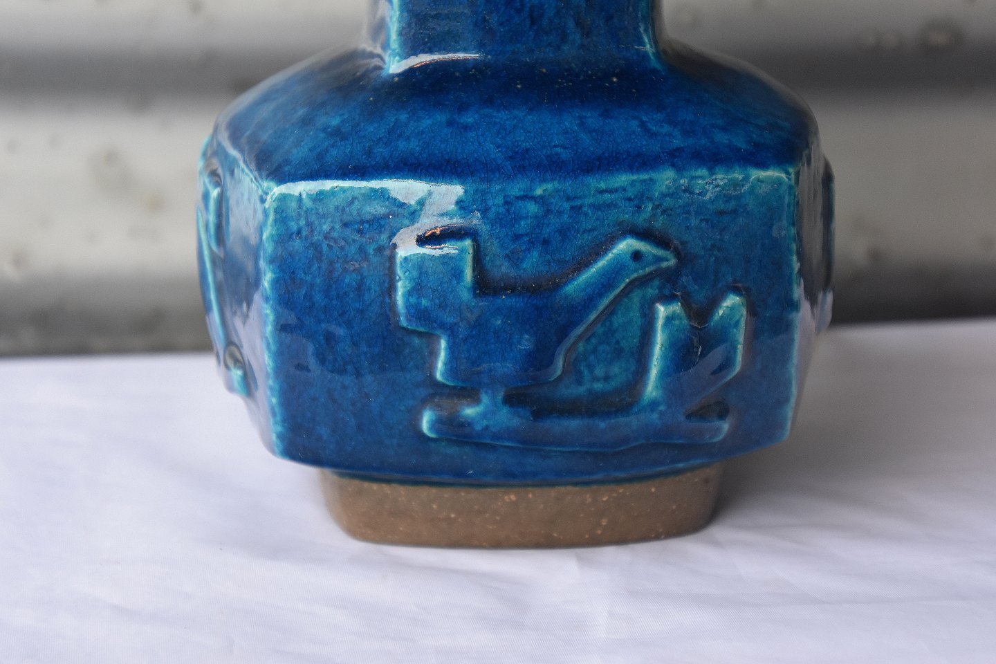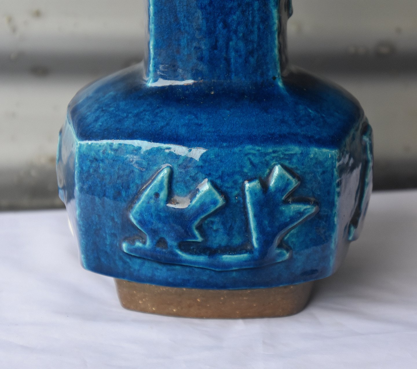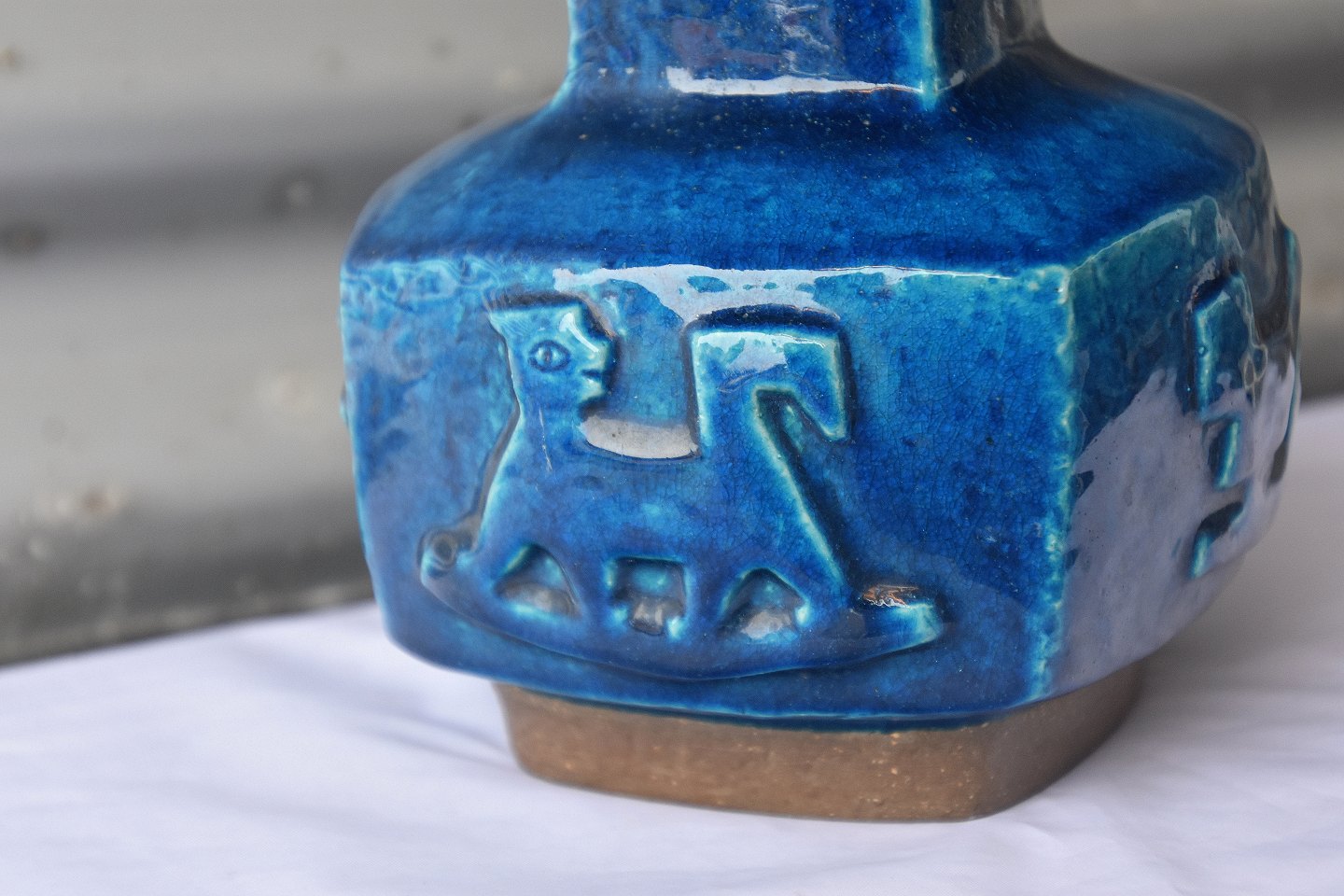 Bordlampe nr. 21702, 4sidets stentøjs lampe fod med fugle og dyr. Lampen er med blåt glasur