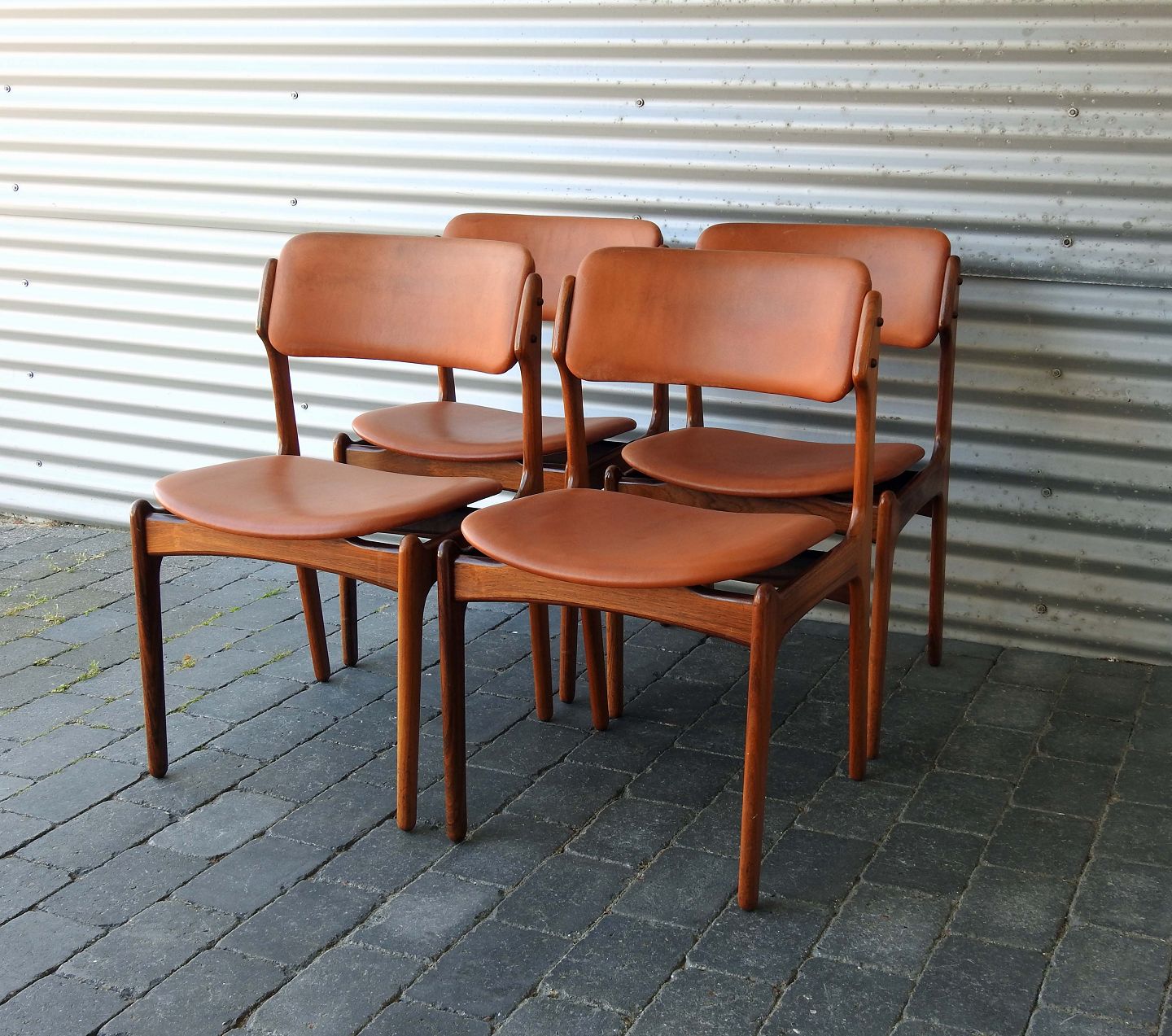Fire styk spisebordsstole i palisander med polstret sæder betrukket med cognacfarvet læder