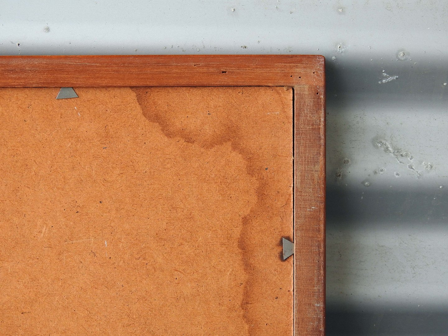 Spejl med ramme af teaktræ med enkelte detaler ved hjørnerne