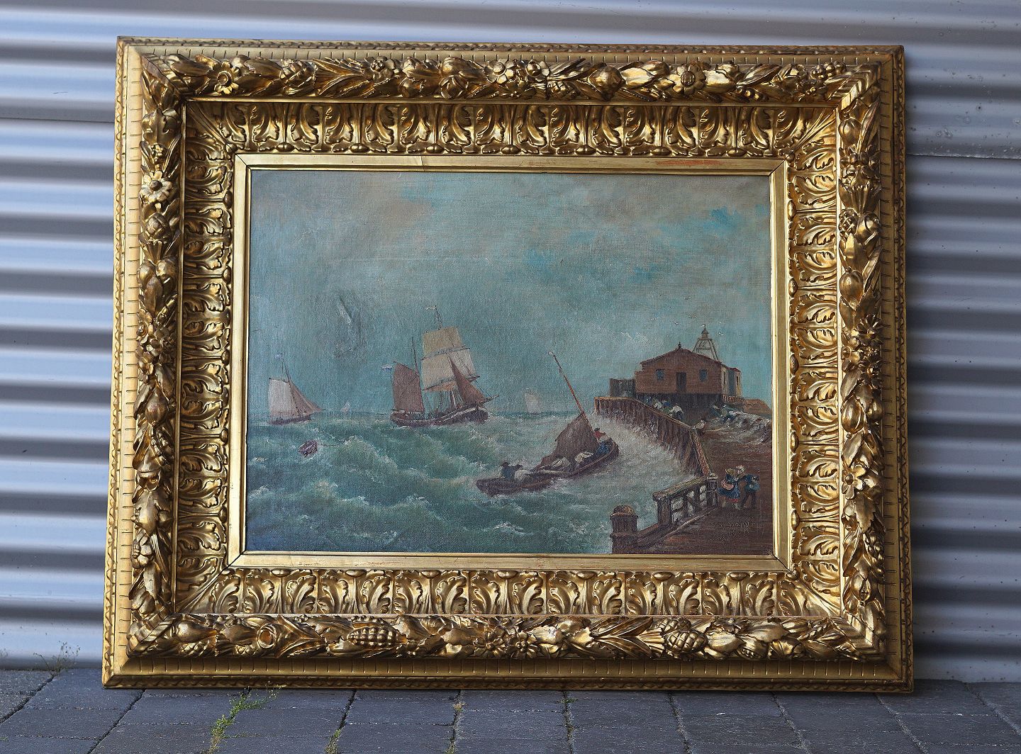 Molemiljø, med små og store skibe i vandet. Maleri, olie på lærred