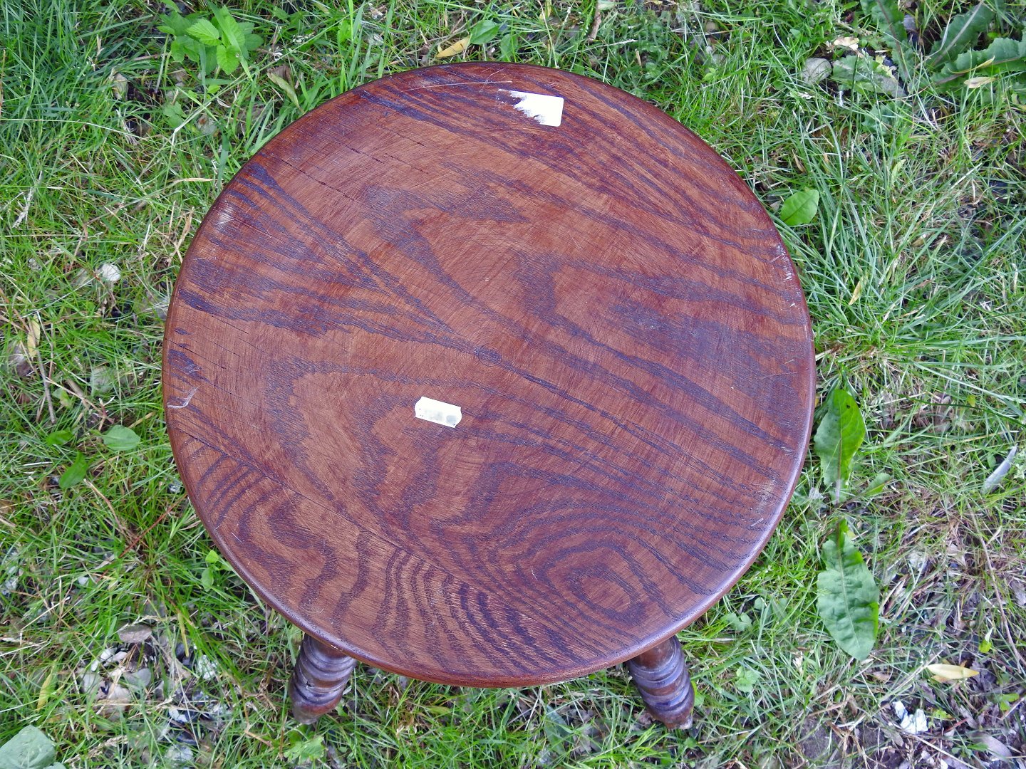 Skammel i ege med fire ben og sæde som skrues op og ned i i højden