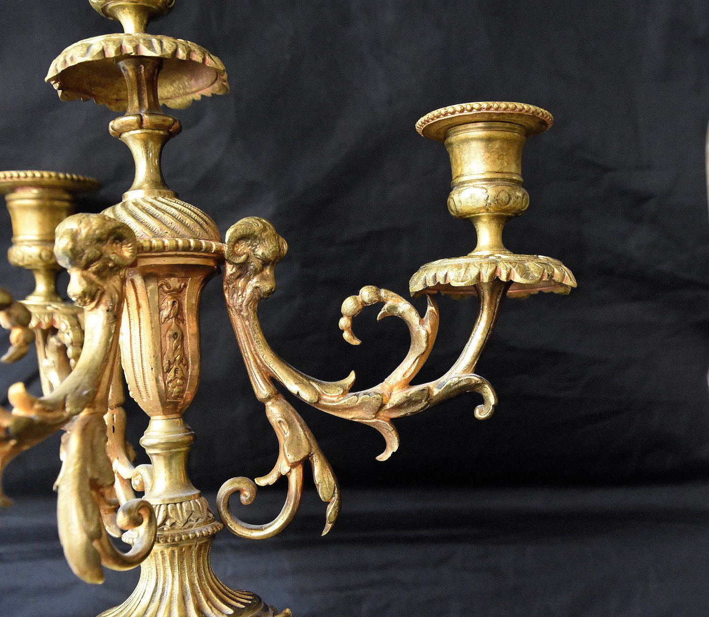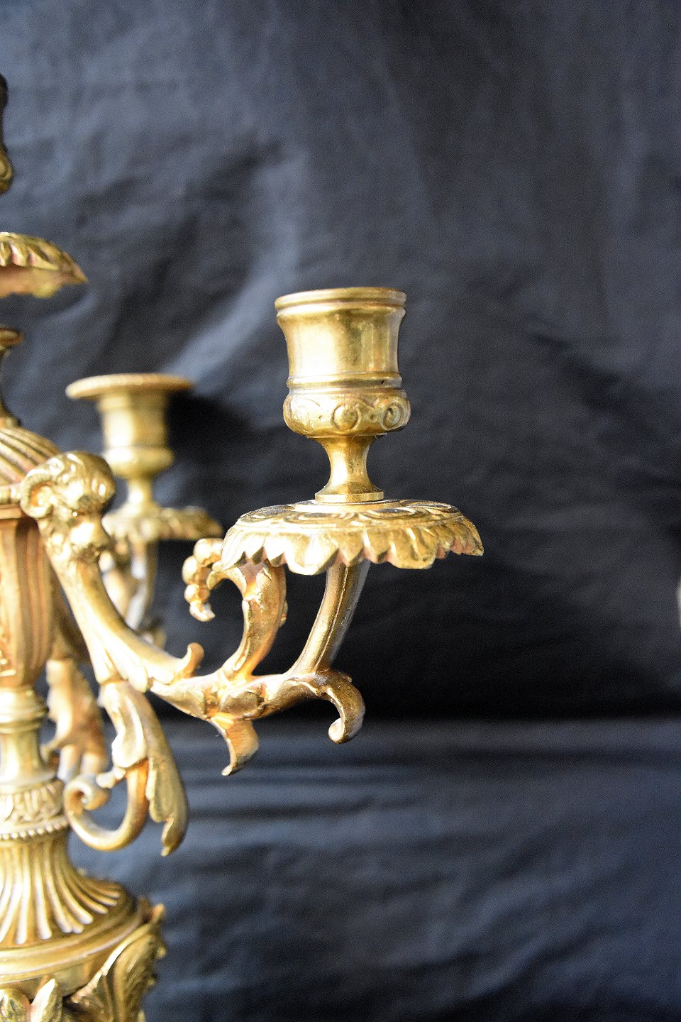 Antik, 5-armet, kandelaber, lysestage, patina, fransk
