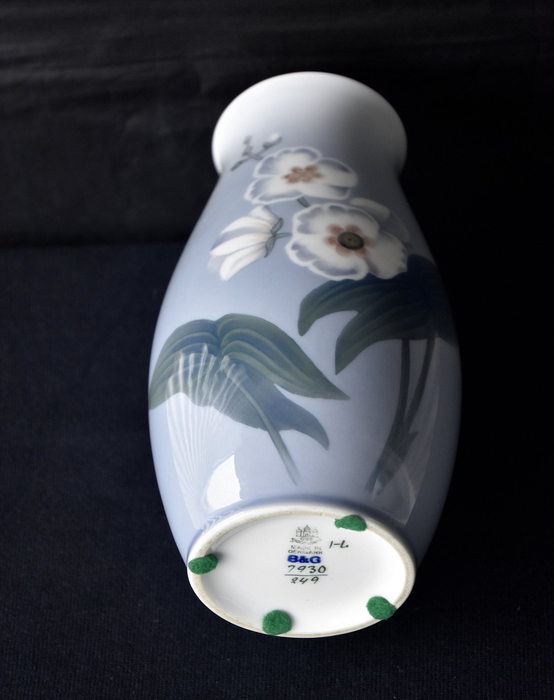 Bing & Grøndahl, vase 7930-249, 1. sortering. Vasen er dekoreret med hvide blomster og mørke grønne blade