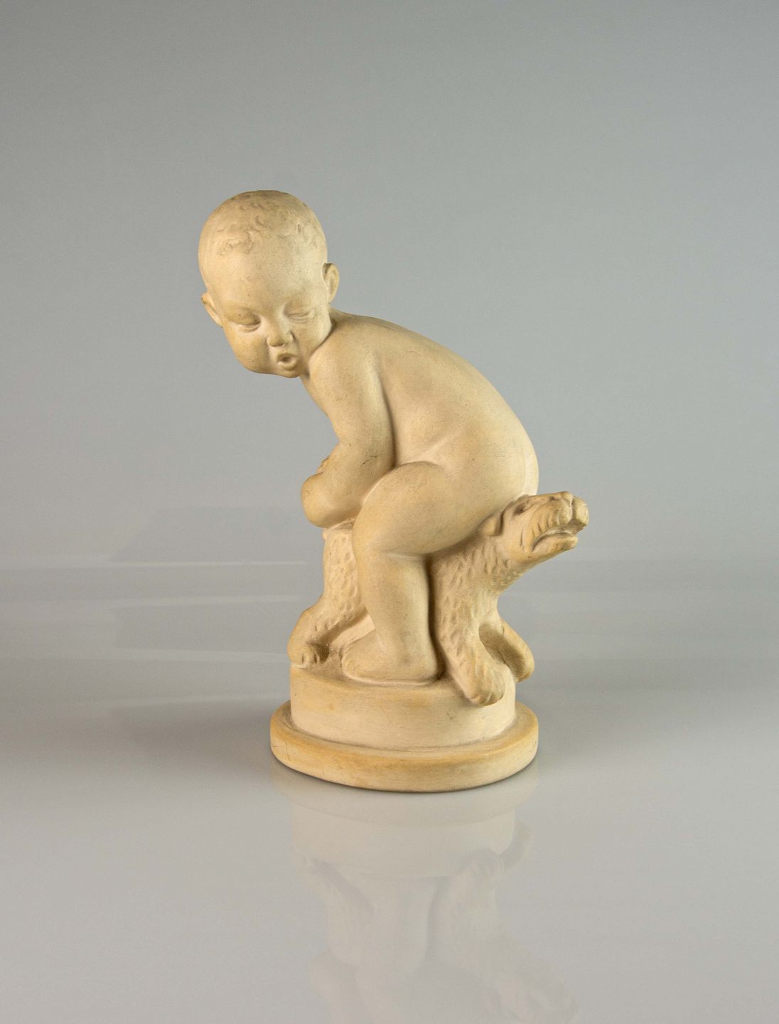 Figur i keramik med motiv af dreng med hund mellem ben