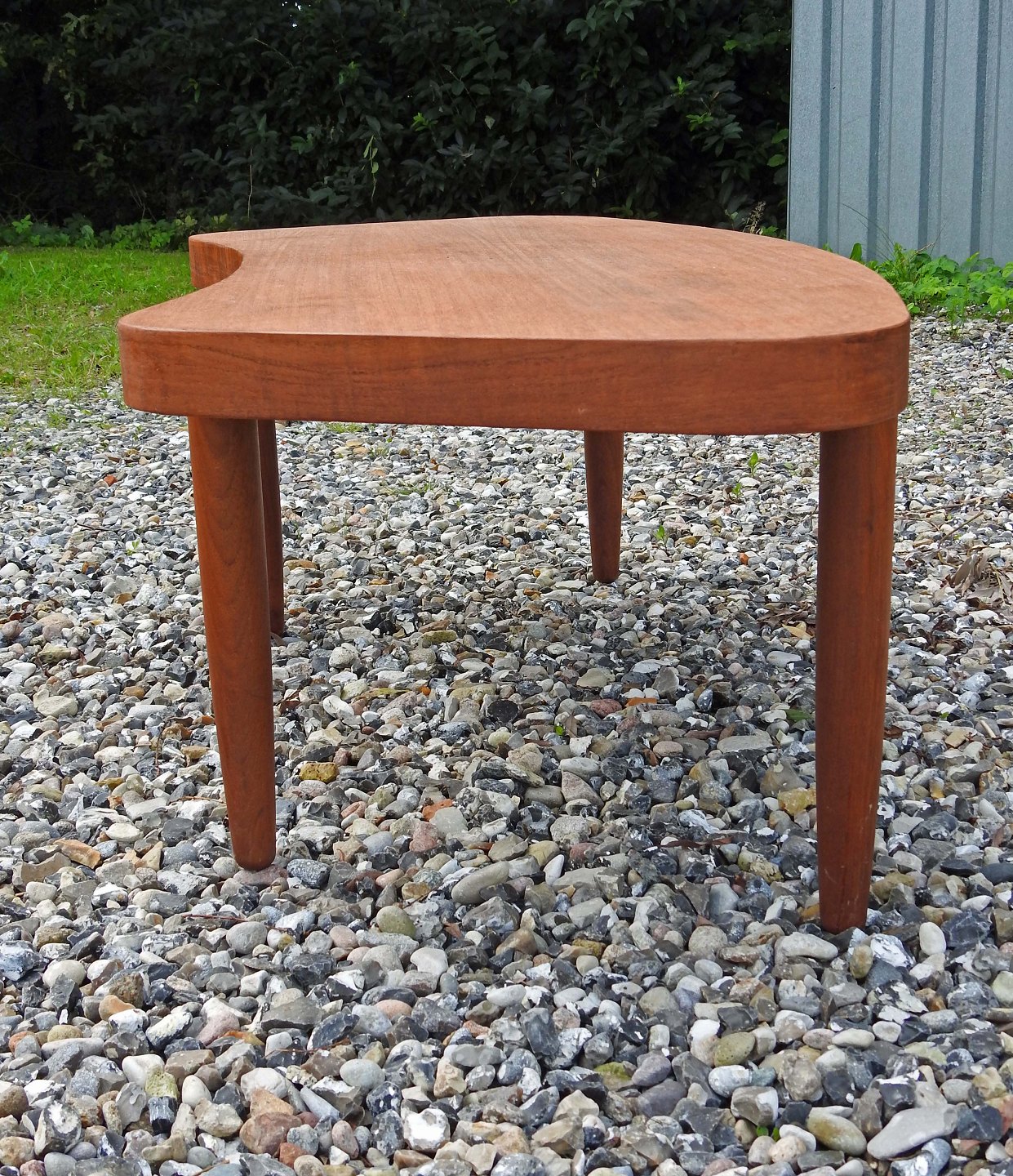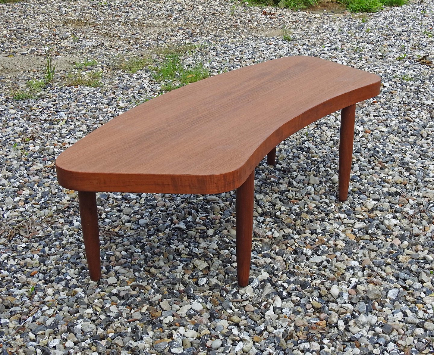 Sofabord i teaktræ med buet form og runde ben i dansk møbeldesign