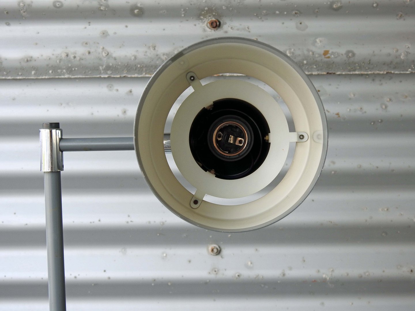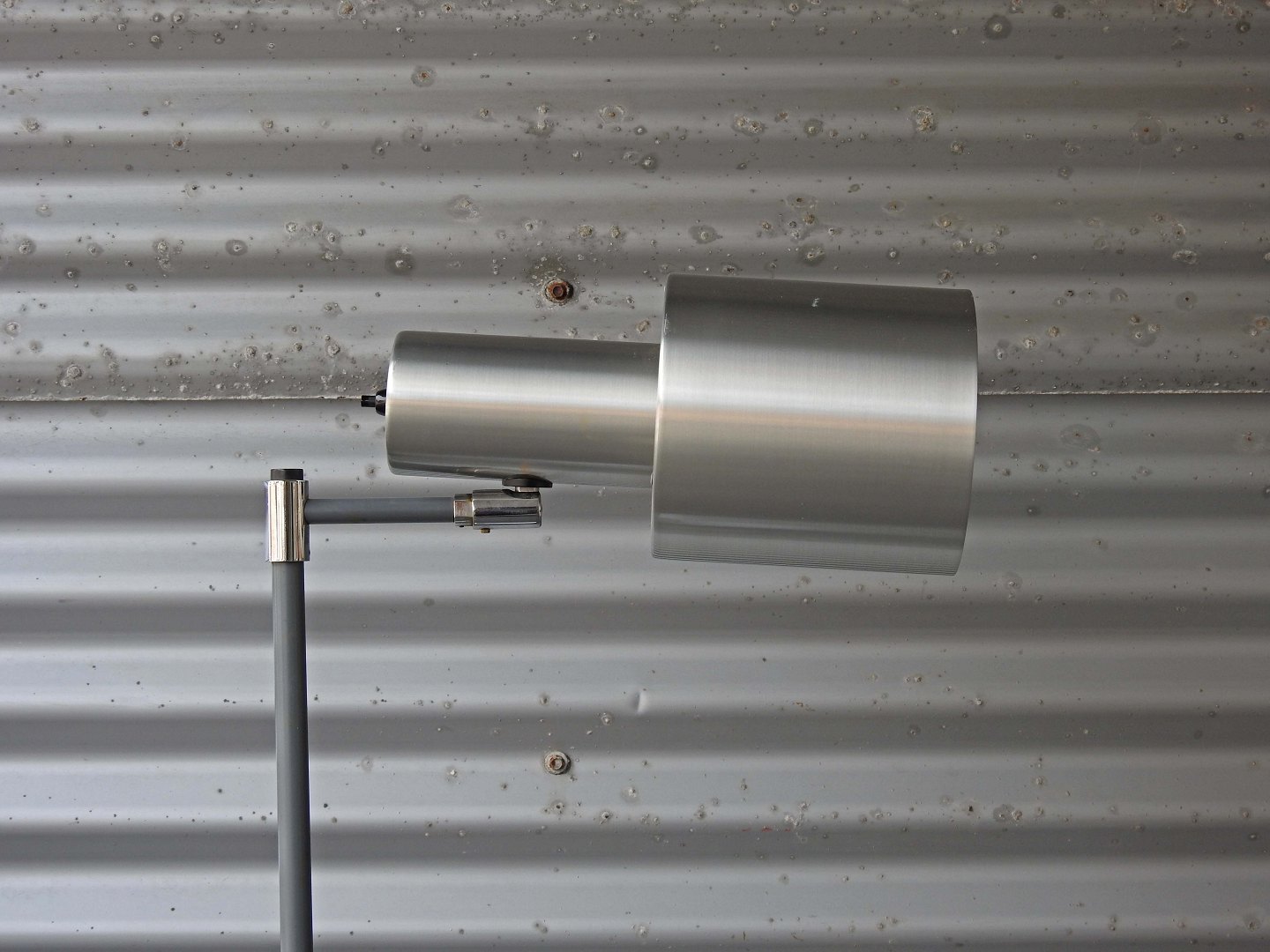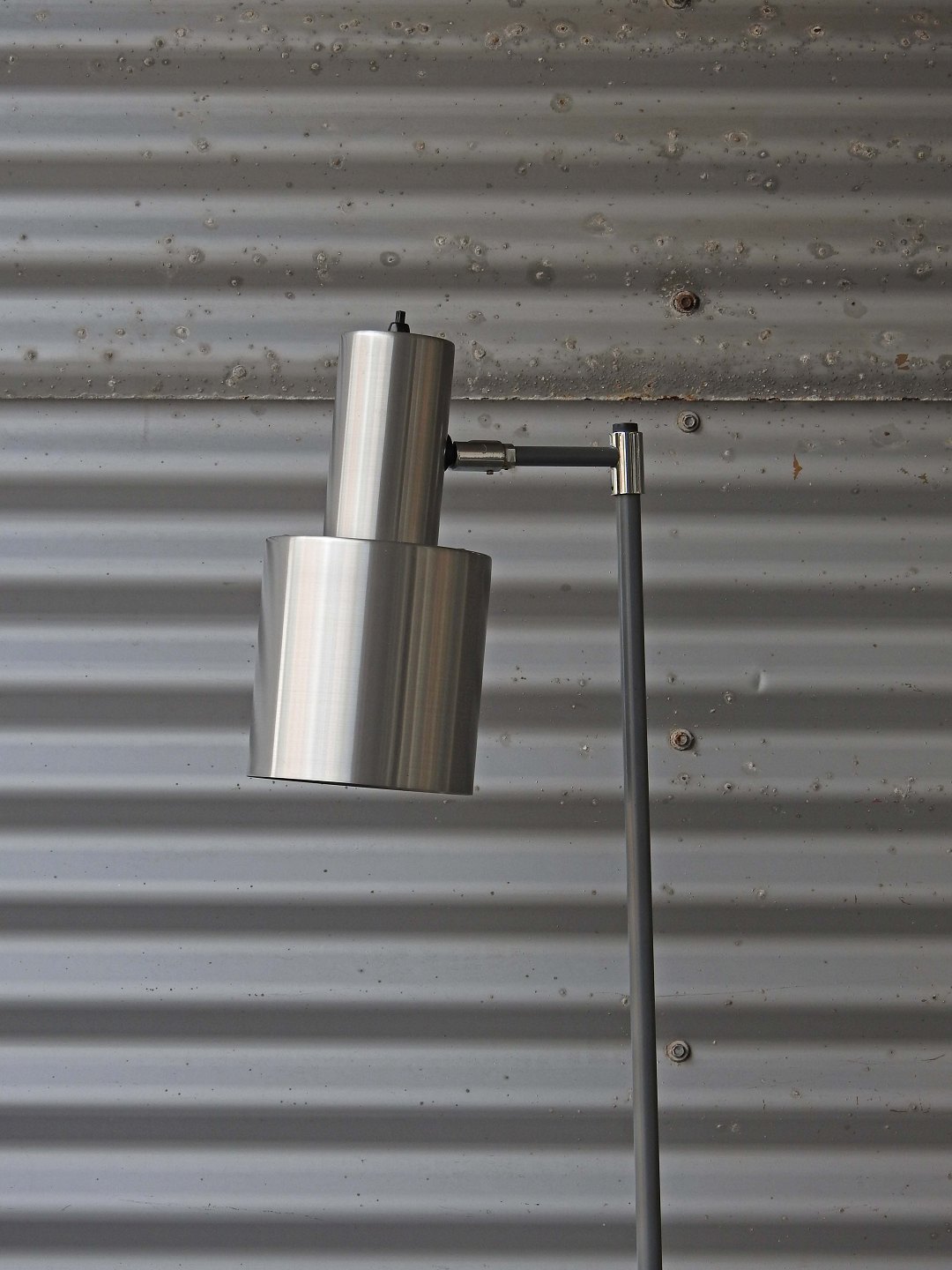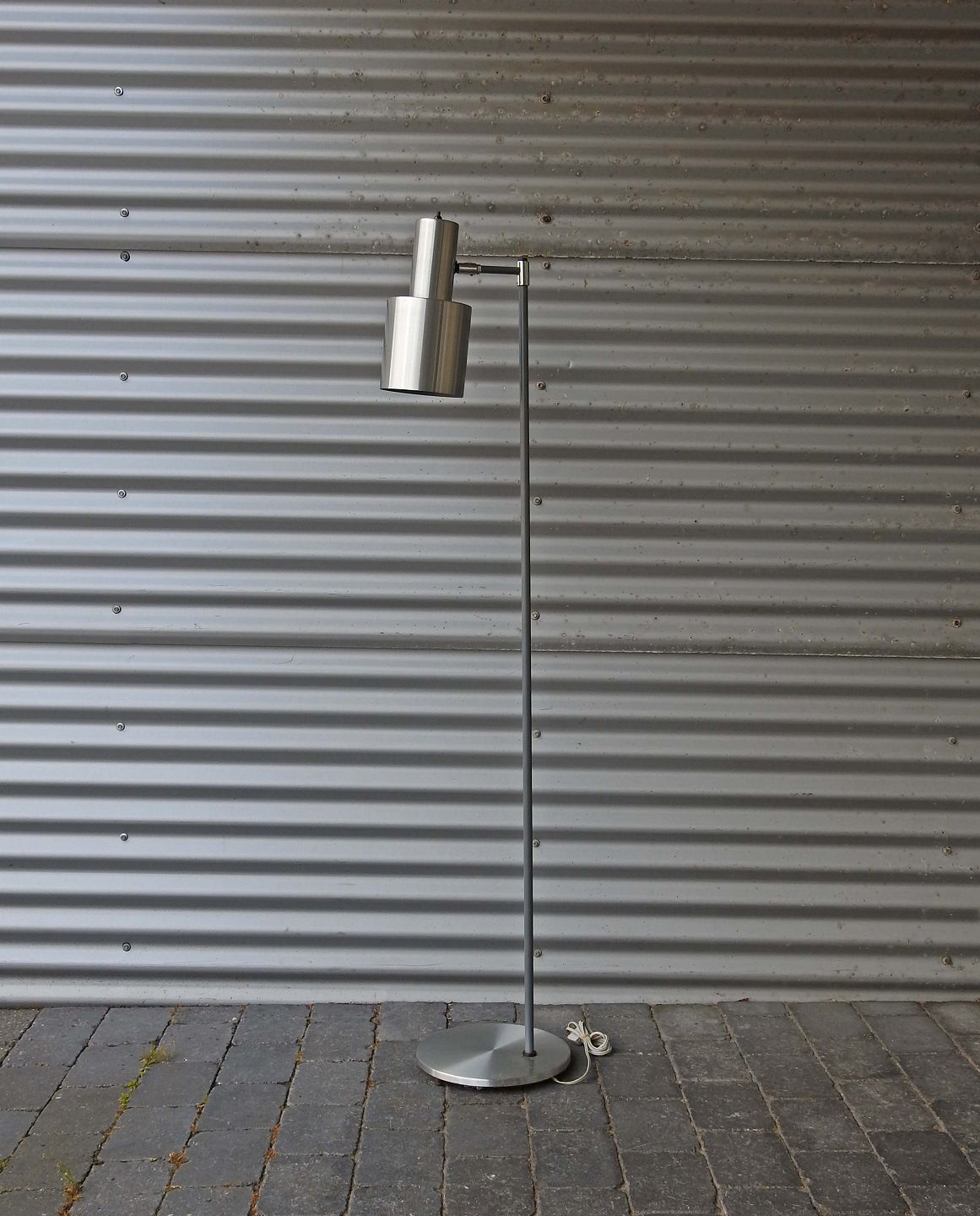 Standerlampe med skærm af børstet aluminium og stamme i grålakeret metal. Model Studio