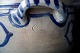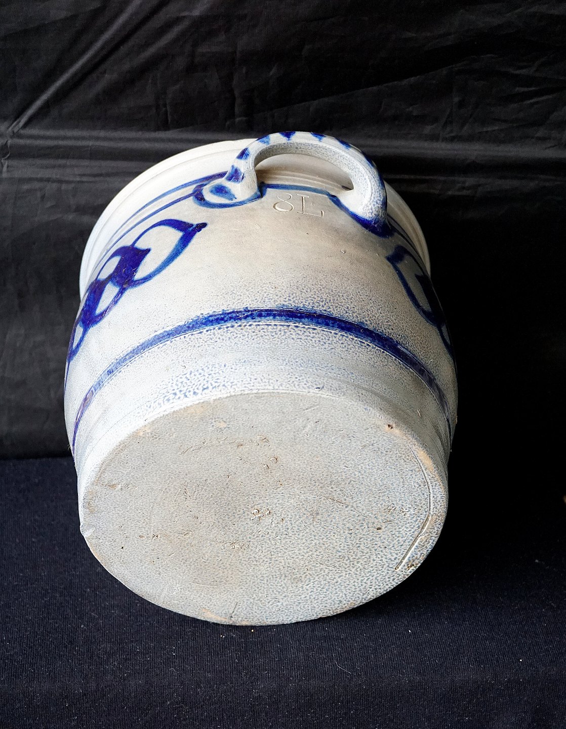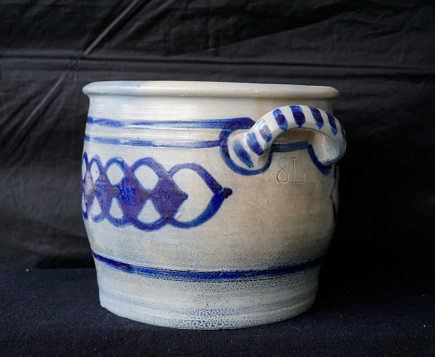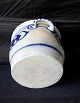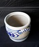 Saltglaseret grå stentøjssylte krukke med blåt mønster, hollandsk syltekrukke.