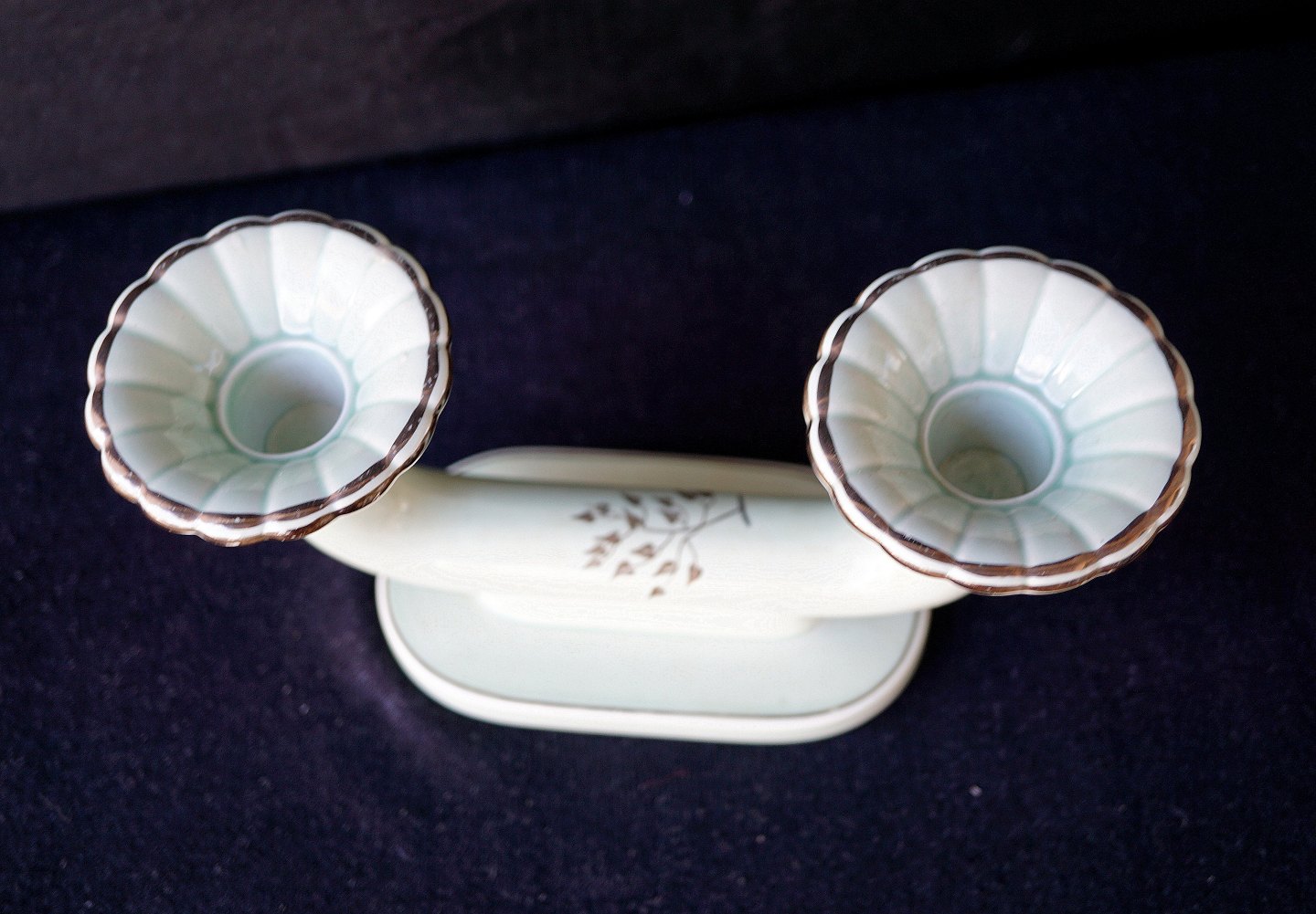 Aluminia, Denmark. Dobbeltarmet lysegrøn lysestage Saltholm, nr. 258, der er malet mørke blade på midten af lysestagen.