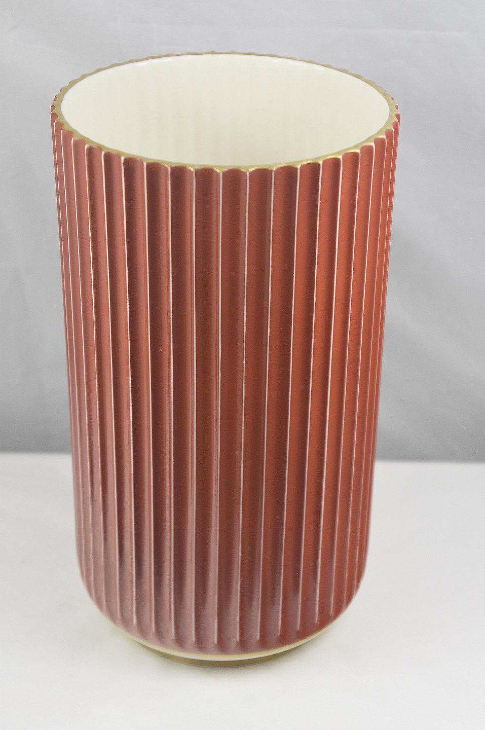 Rød Lyngby vase i porcelæn med riflet korpus og guldkant