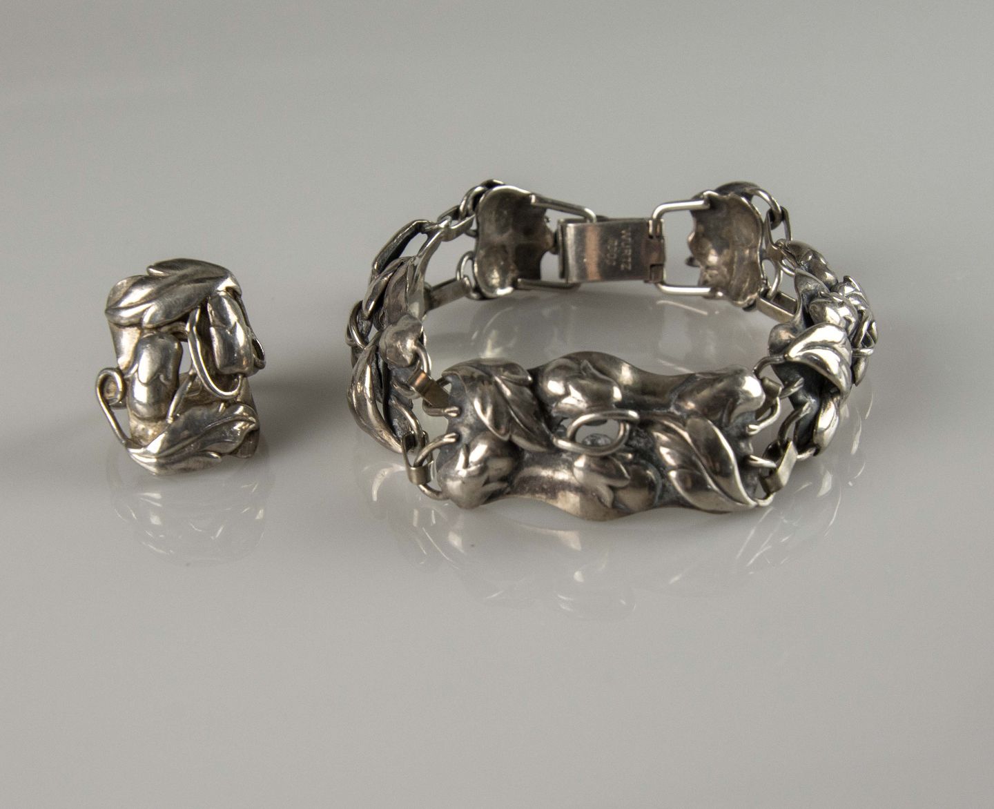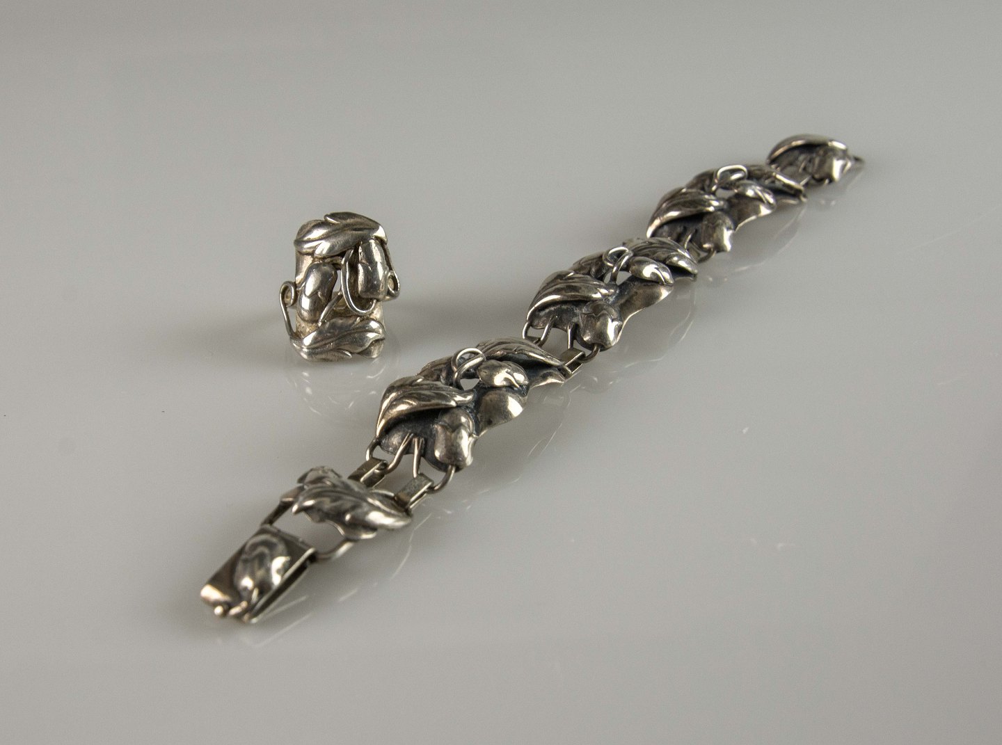 Smykkesæt med armbånd og ring i sølv med motiv af blade og agern