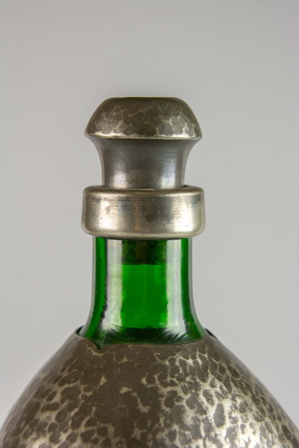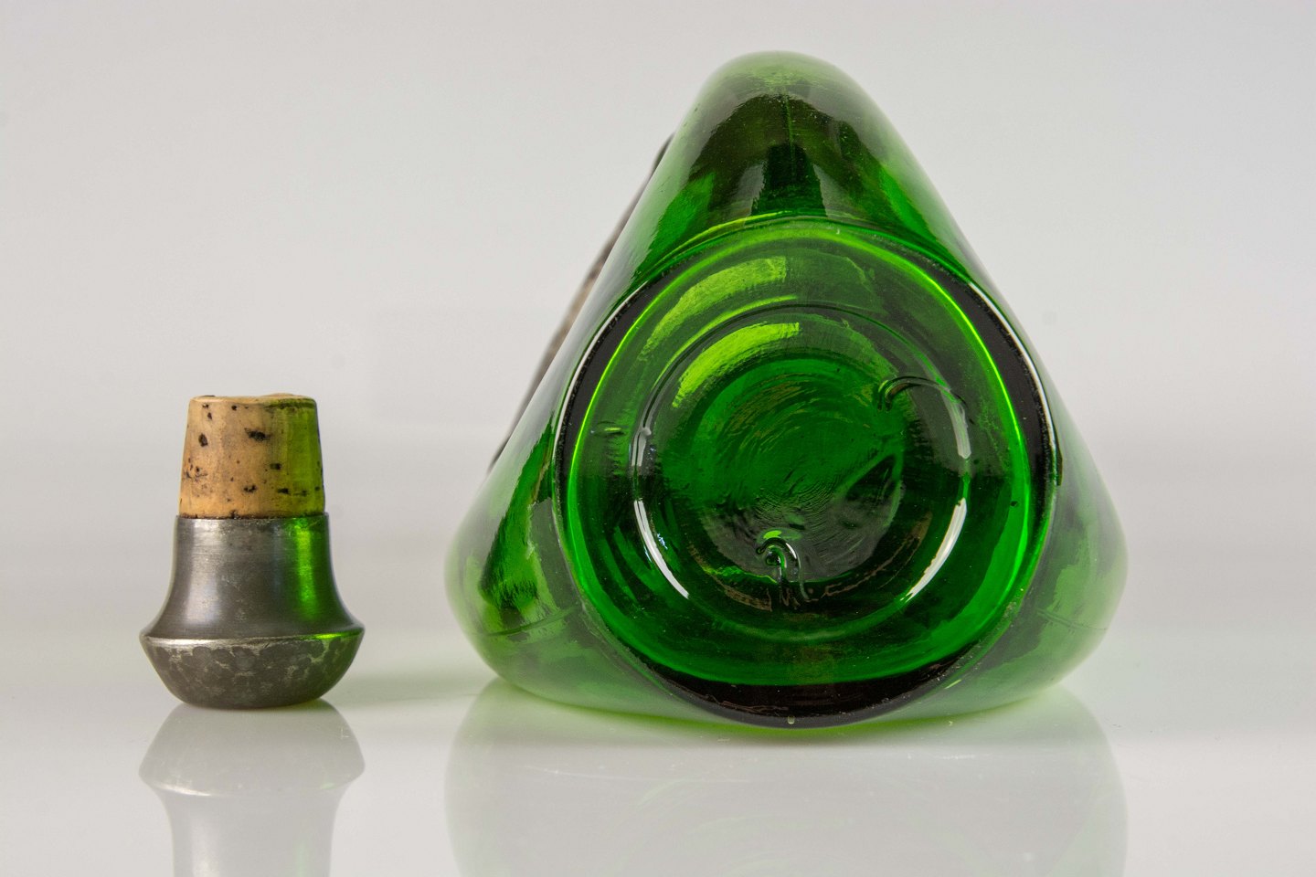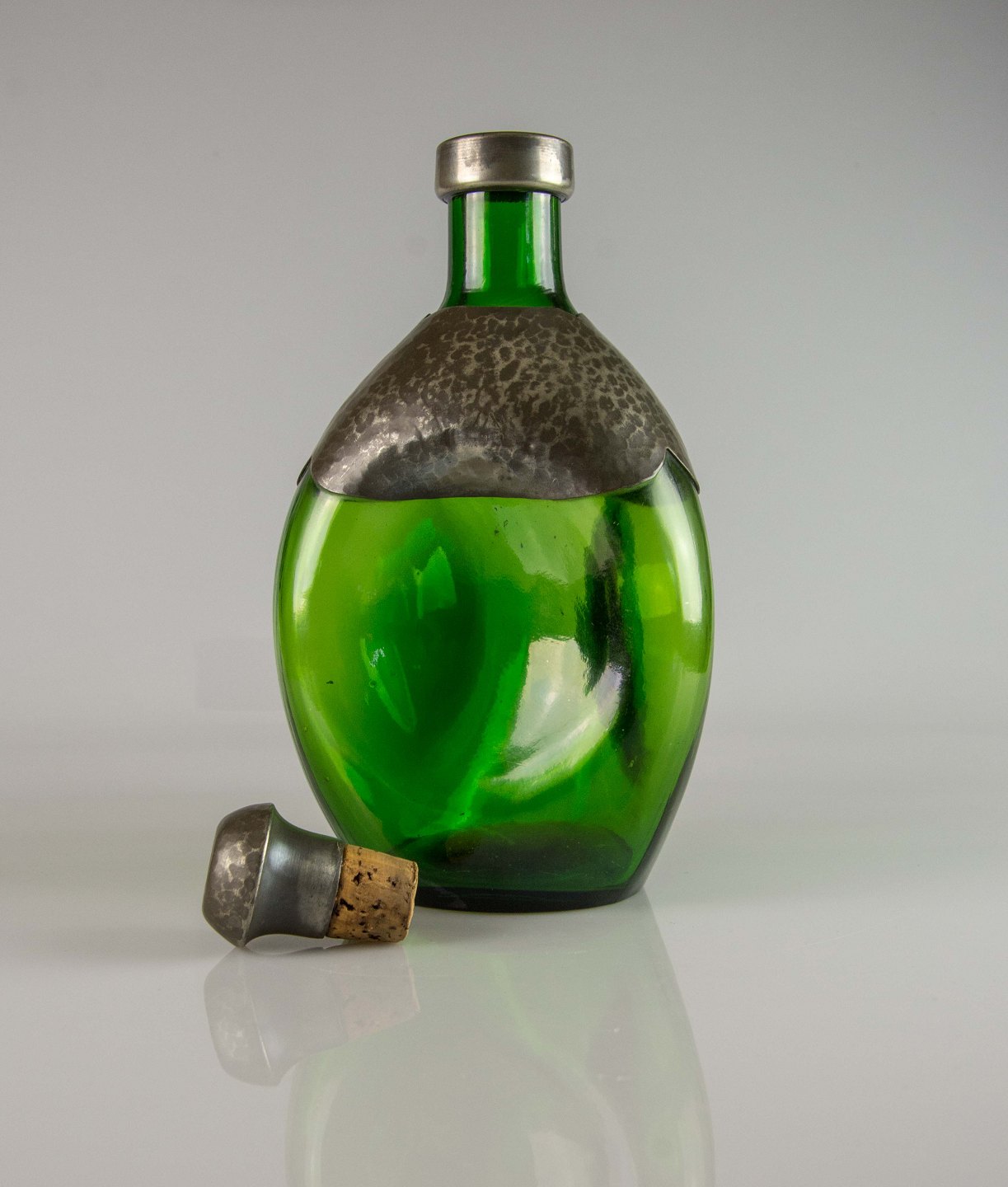 Karaffel i grønt glas med tinbelægning og korkprop beklædt med tin i dansk design