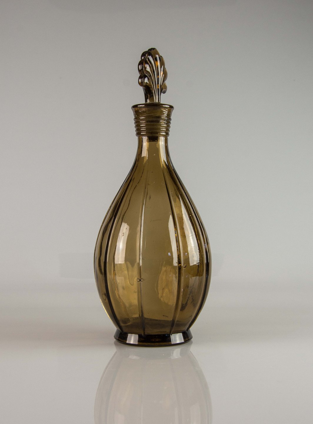 Karaffel i presset brunt glas med glasprop i dansk design