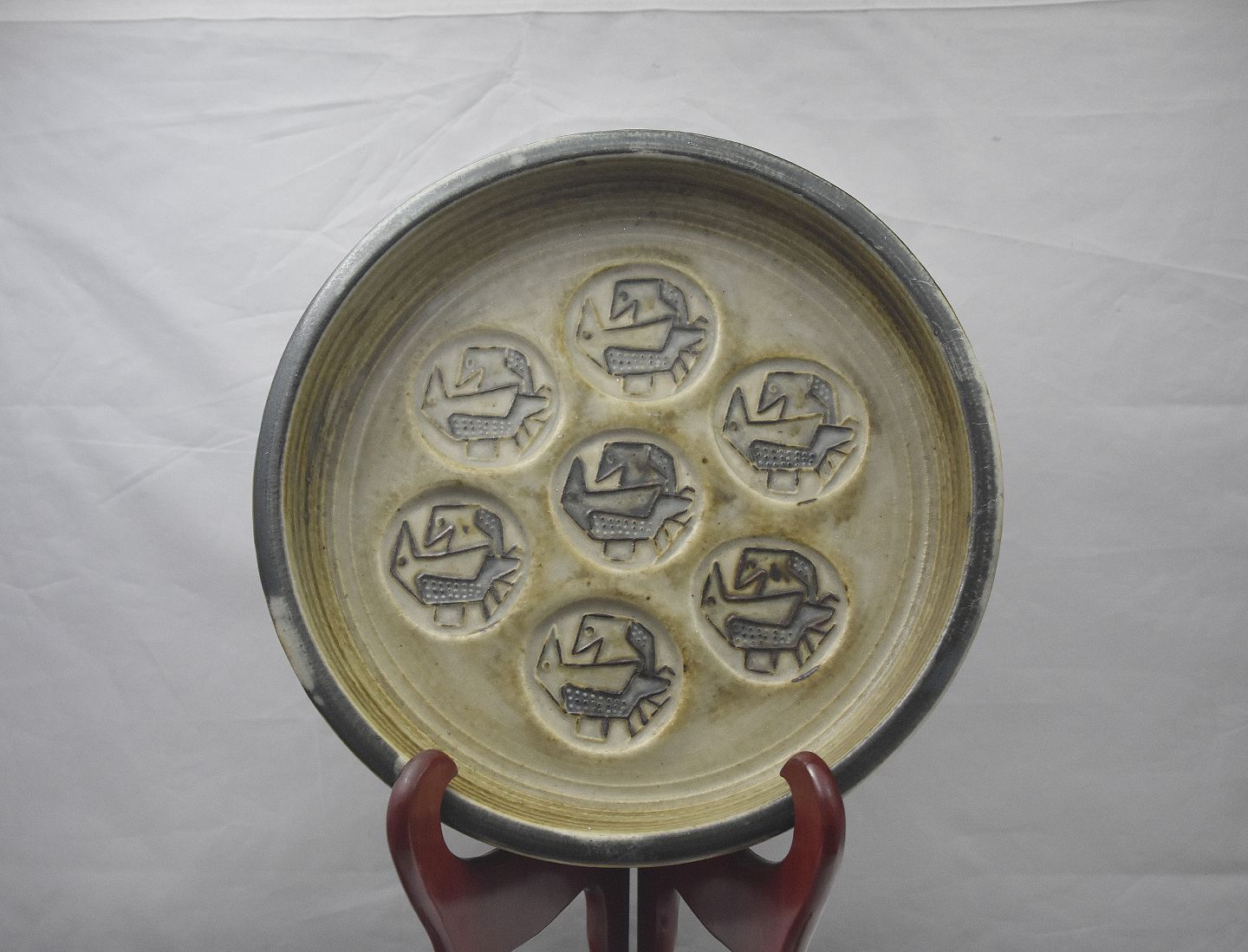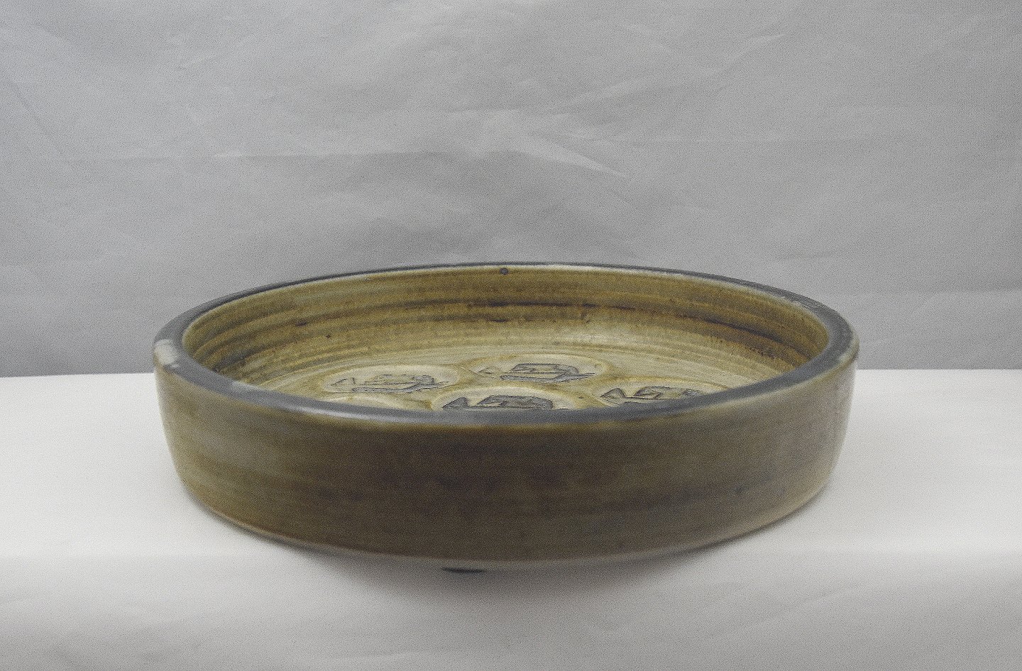 Kongeligt rundt fad i stentøj med motiv af fugle