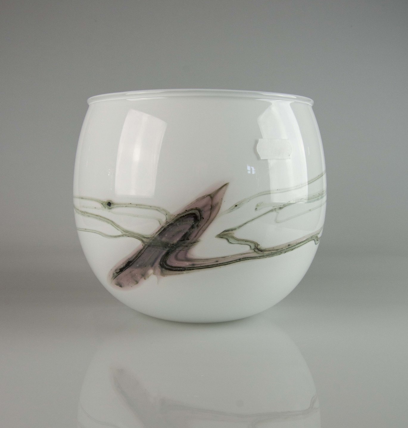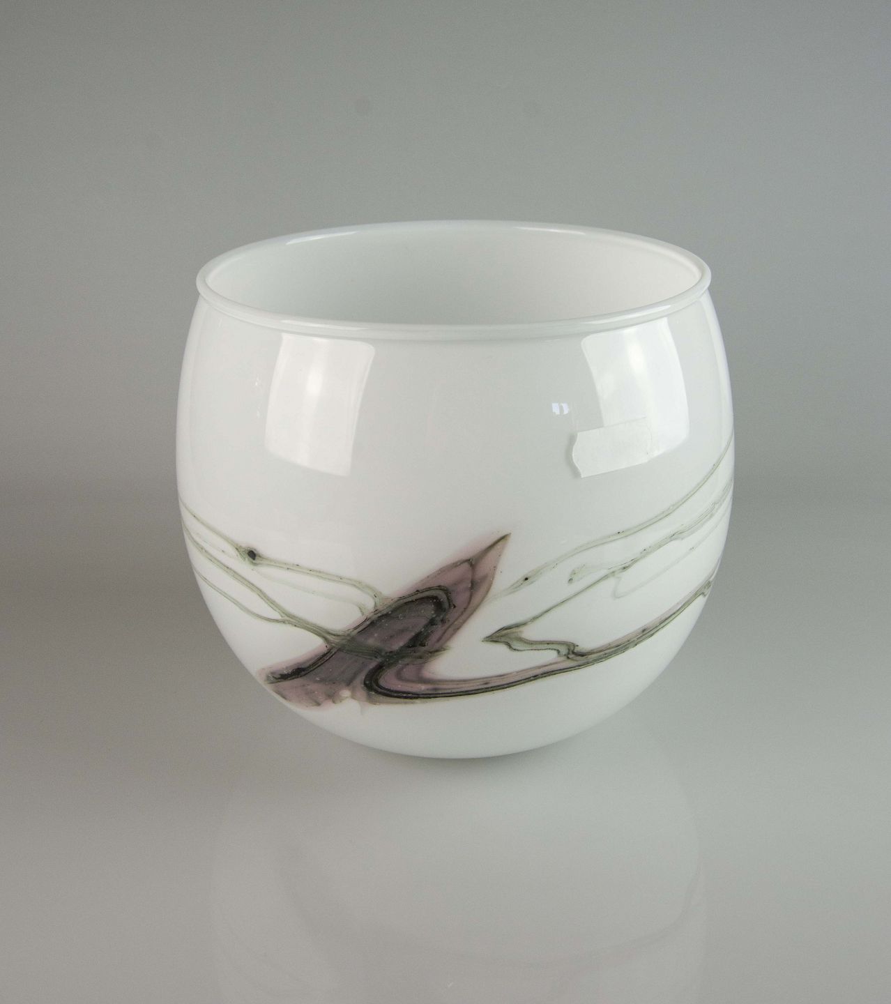 Vase i opal hvid glas med mønster i rosa og mørke nuancer