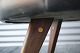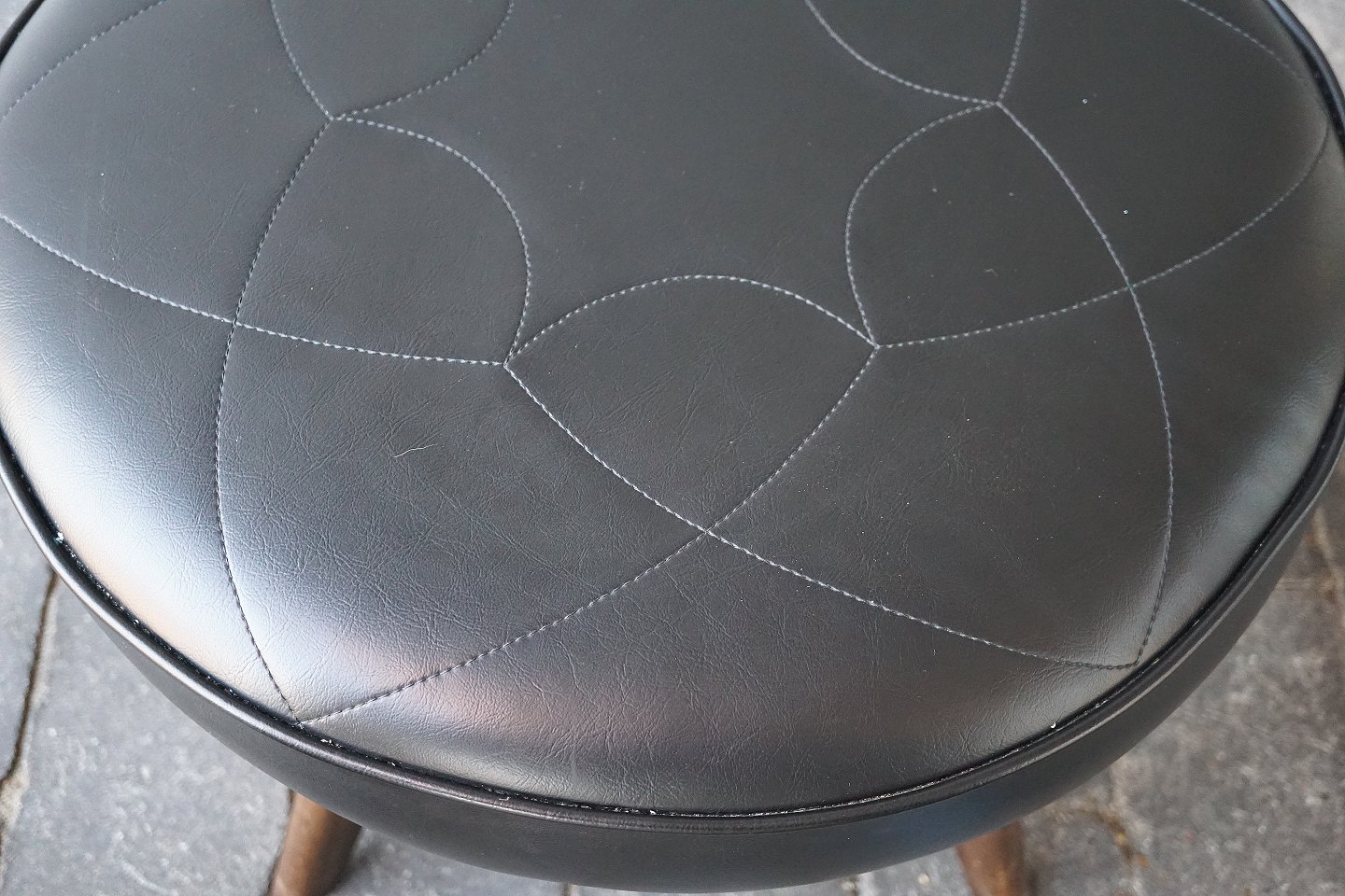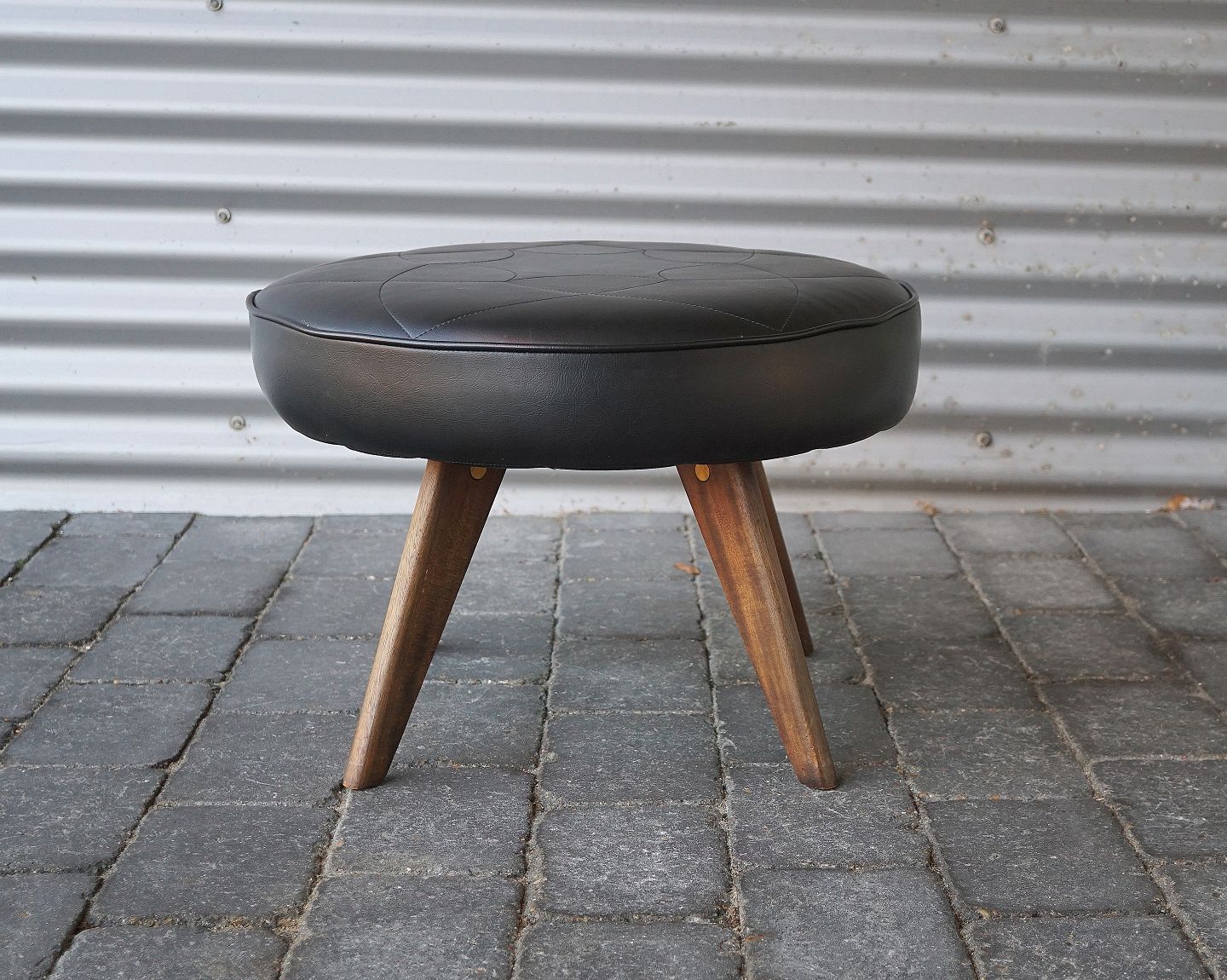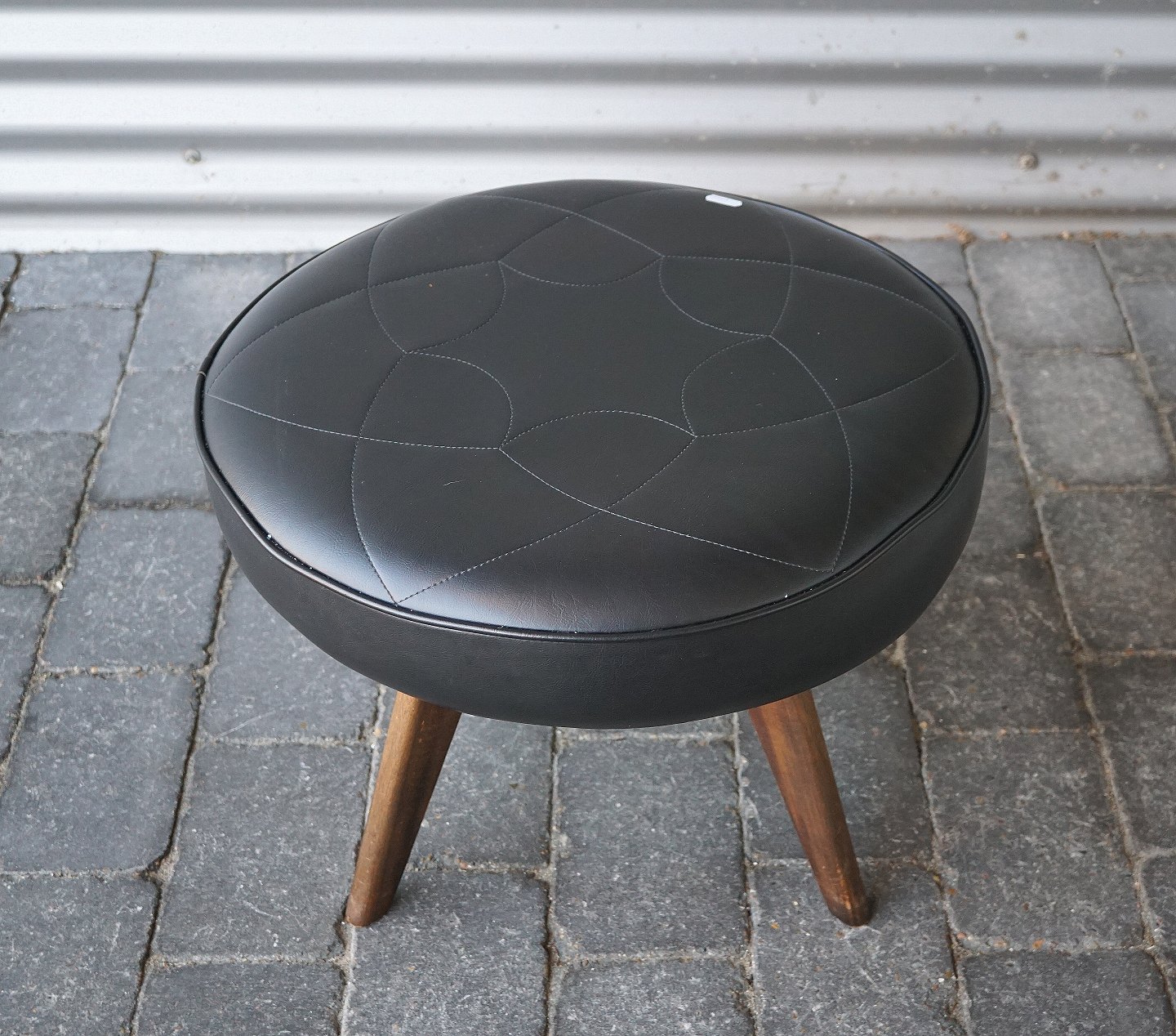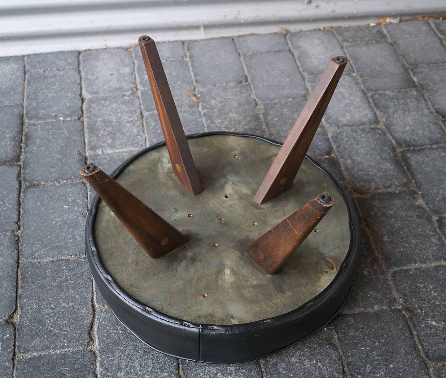 Taburet/skammel med teaktræsben, der er indlagte stolesøm i benene. Taburetten/skamlen er betrukket med kunstlæder. Benene er sat i med messingdyvler