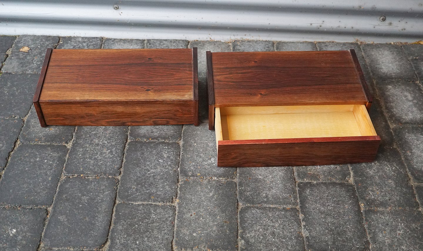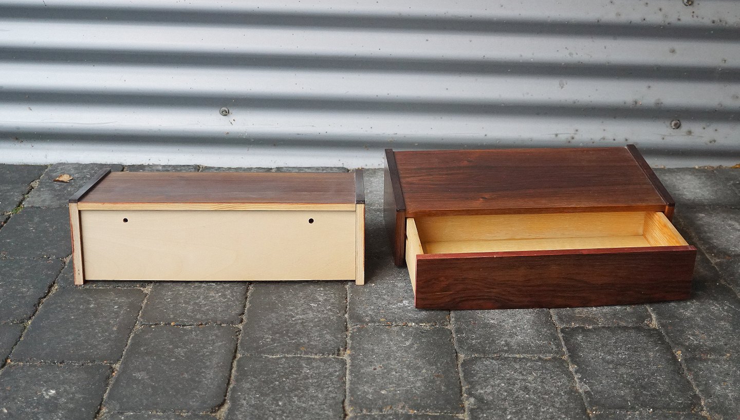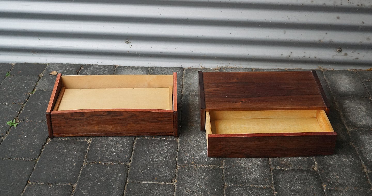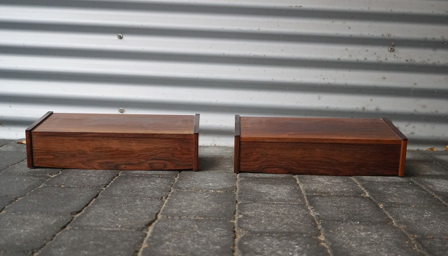 2 stk. sengeborde, i palisander. Sengebordene er til at hænge på væggen