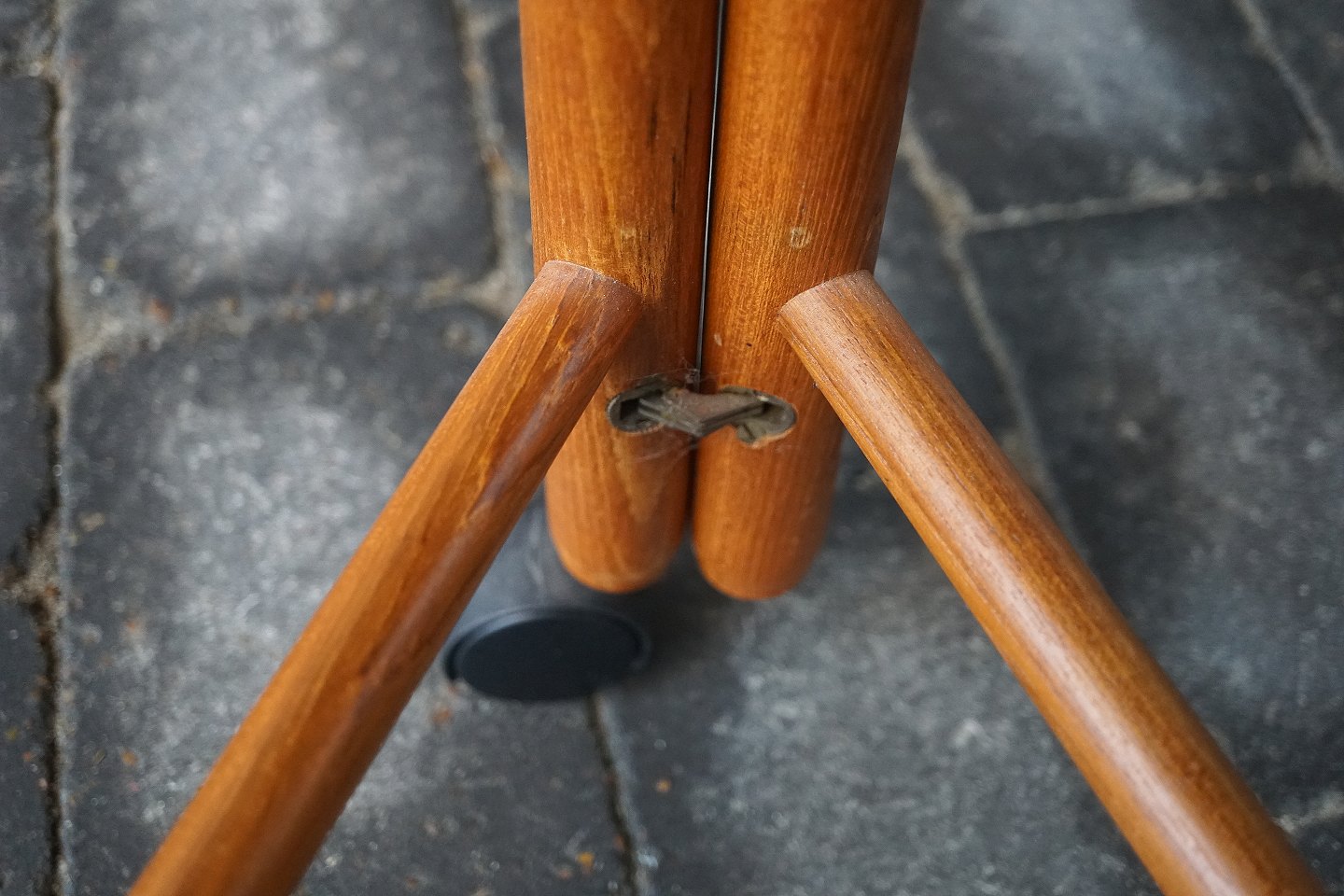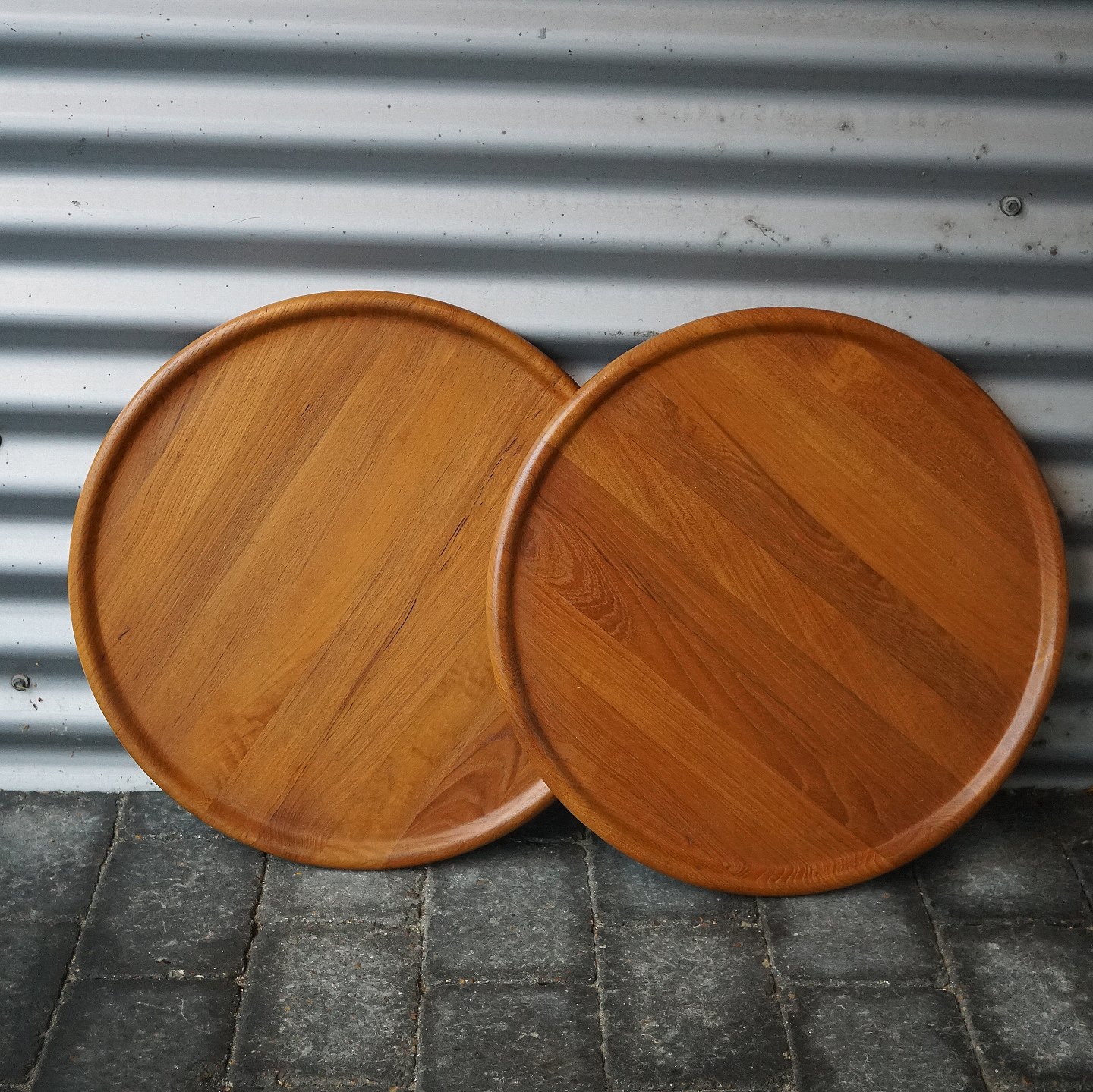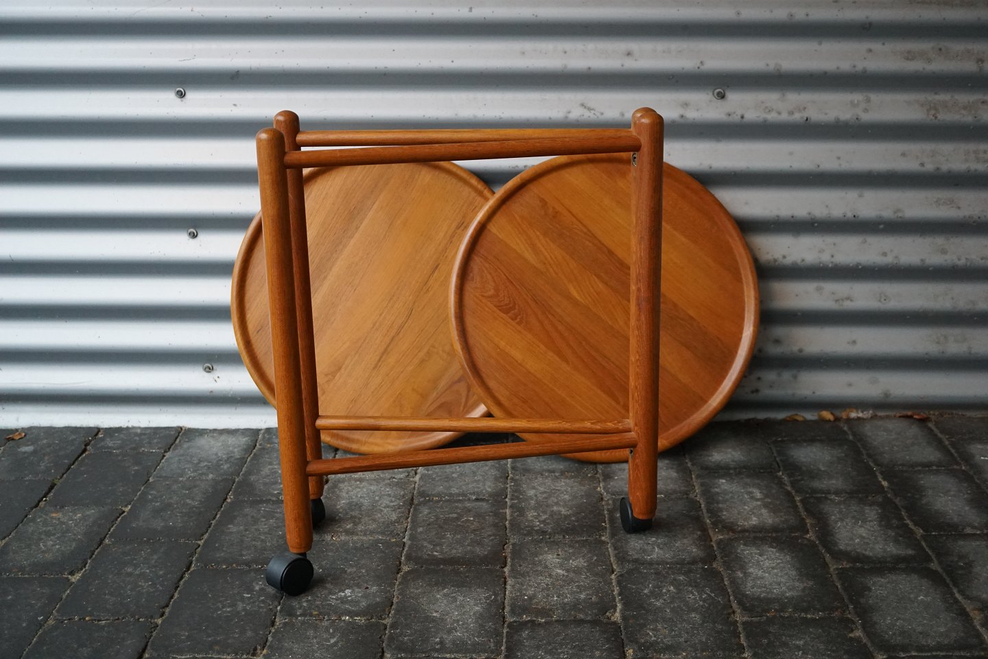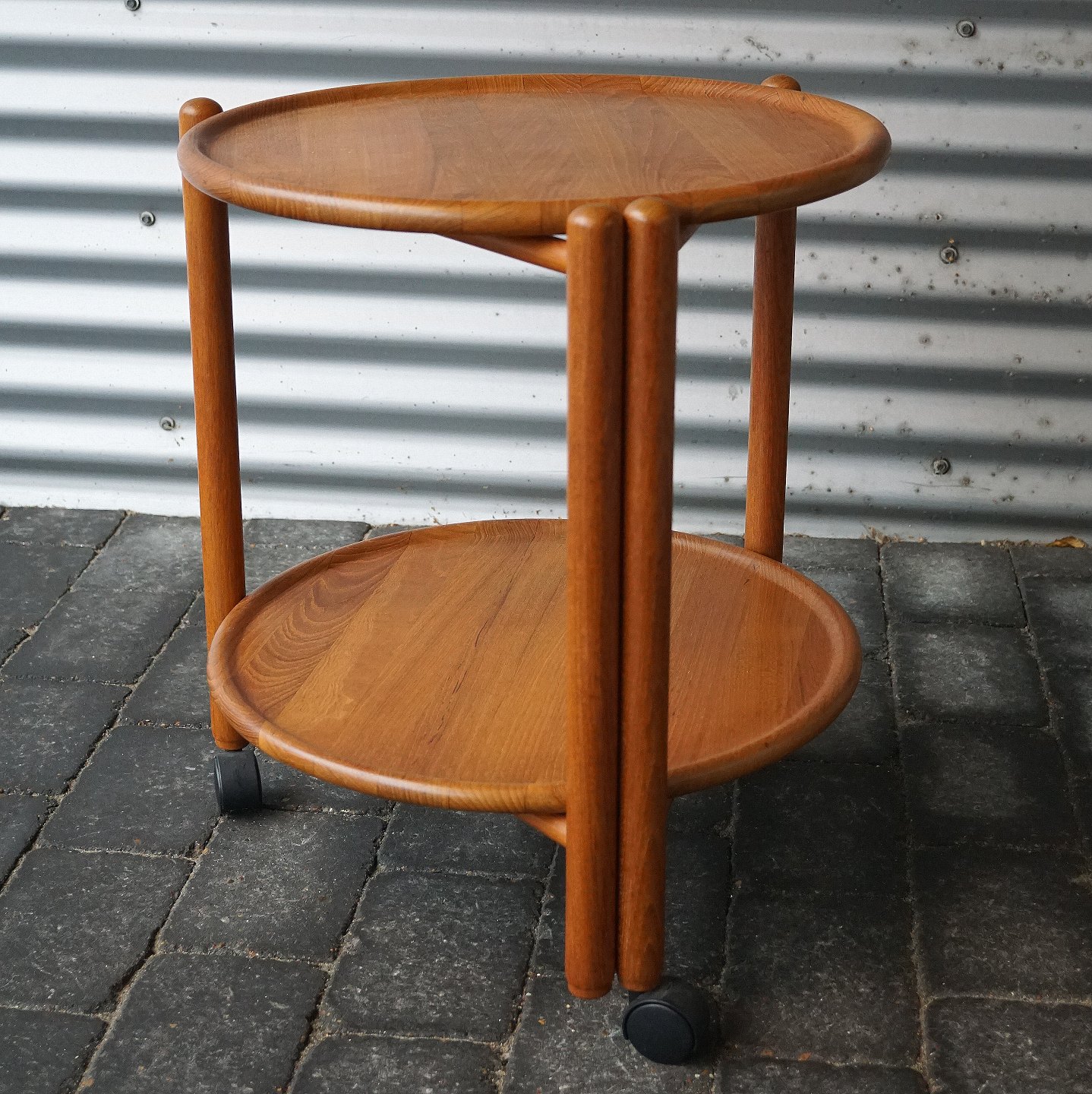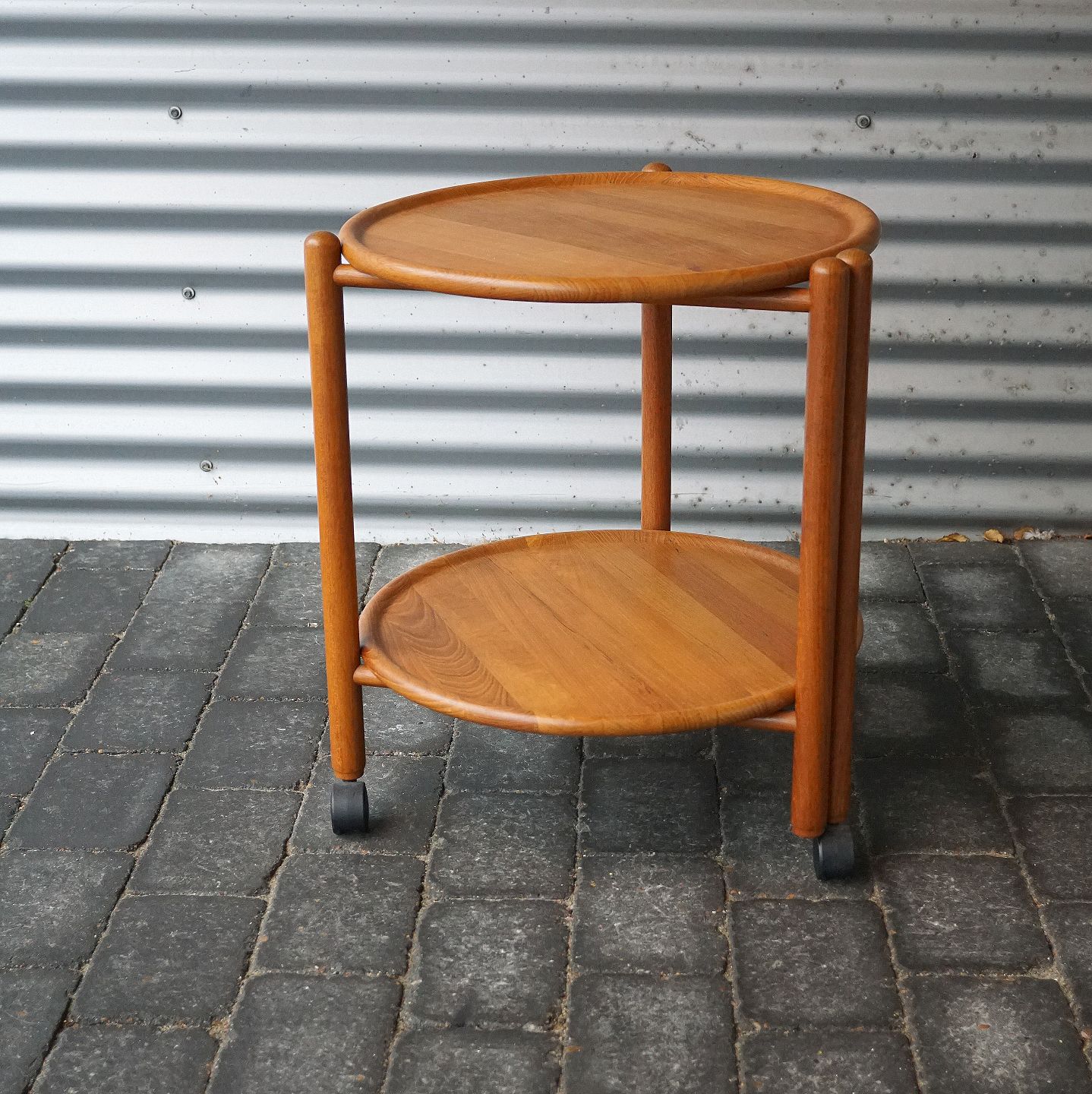 Rundt serveringsbord, massiv teaktræ. Den ene af pladerne kan sættes oven på den anden, så den øverste kan dreje rundt (se billede 3). Pladerne kan tages af og stellet kan slås sammen.