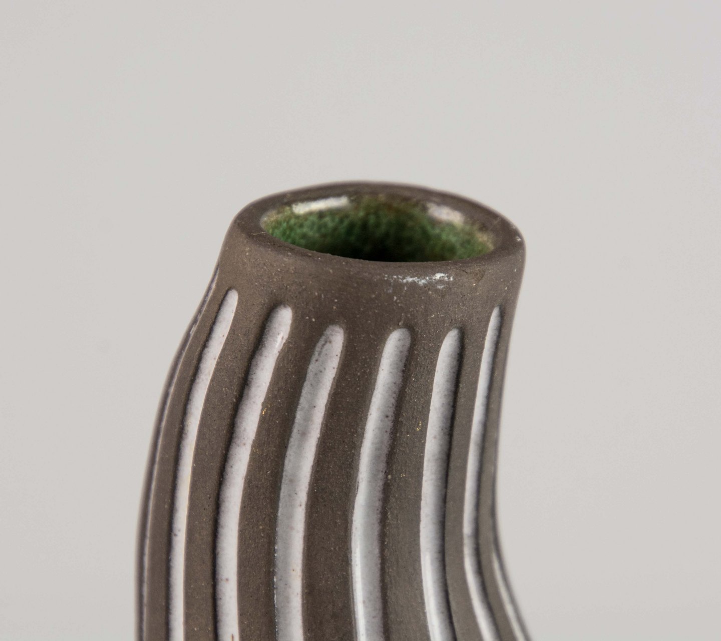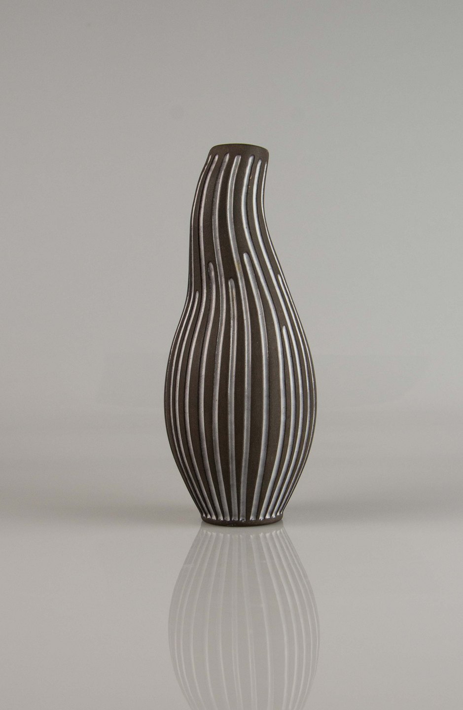 Keramik vase. Vasens hals er lidt skæv. vasen er brun og med hvid striber