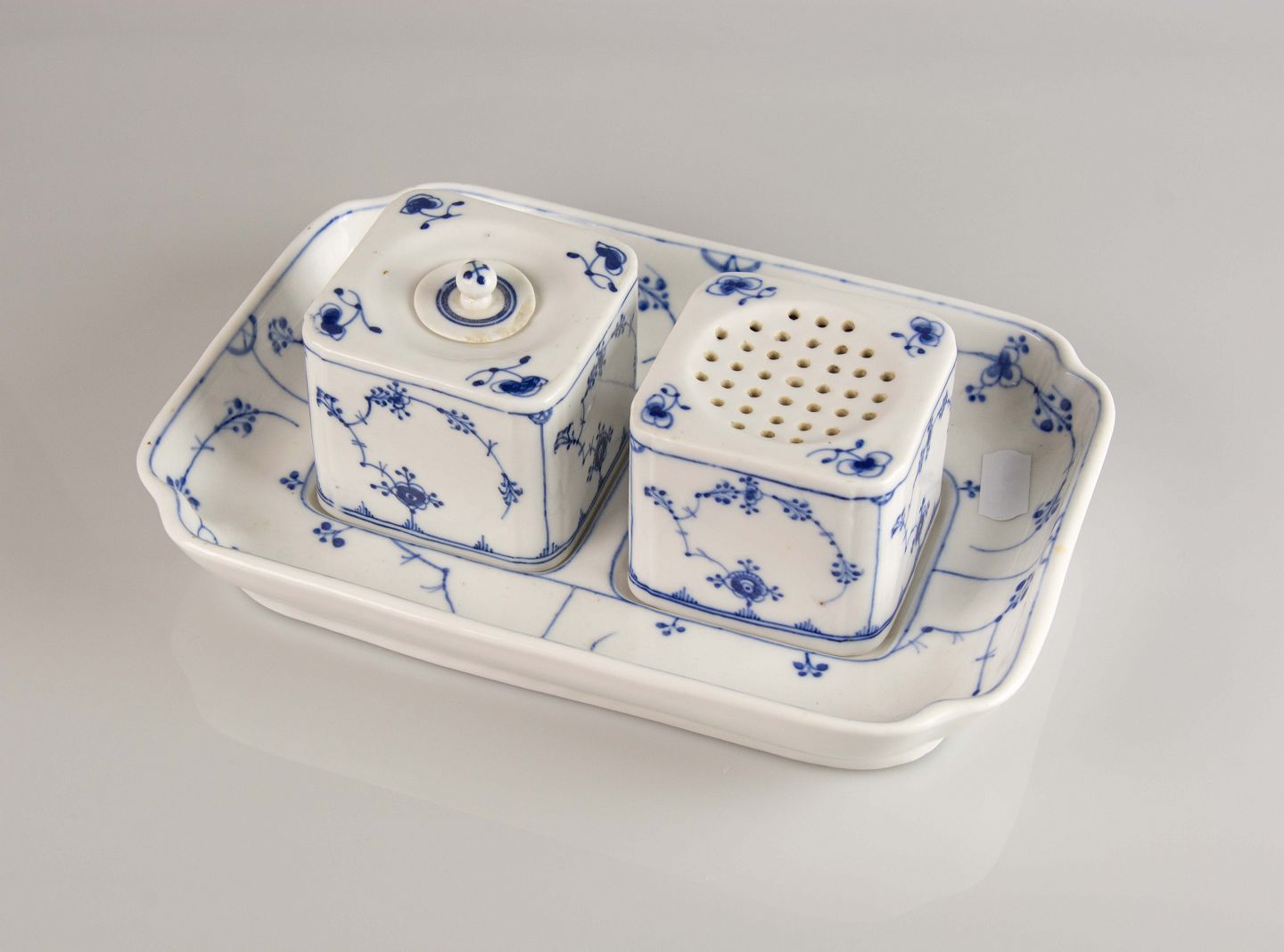 Signeret med tre blå bølger og består af et fad med blækhus med låg og strøhus.