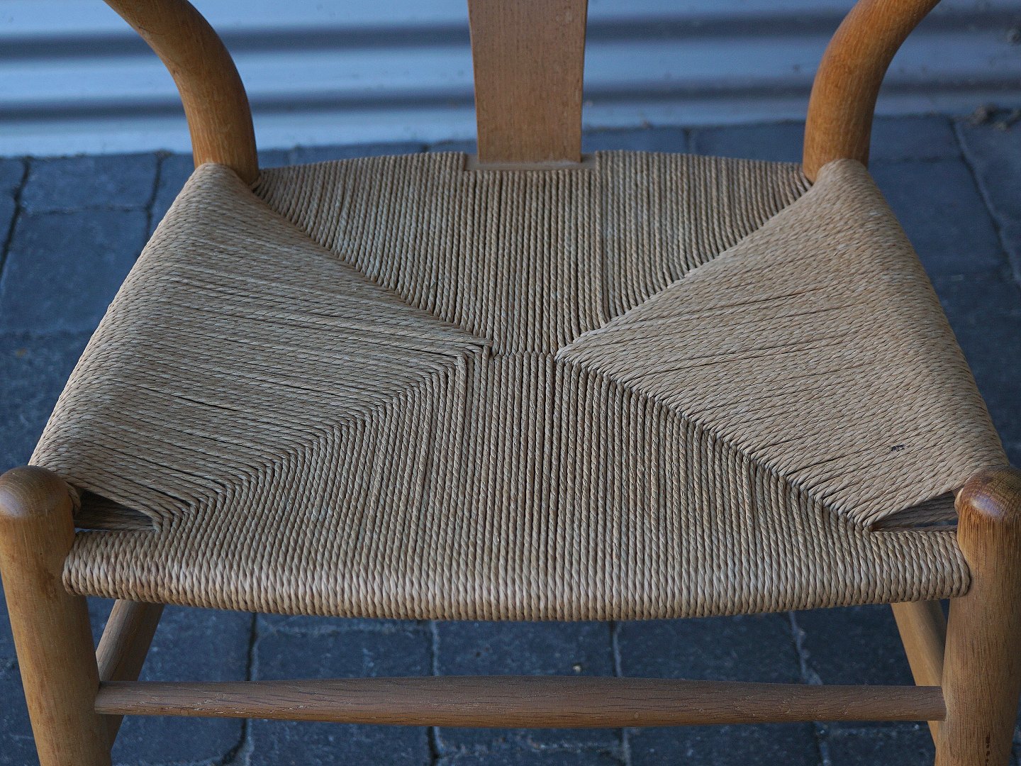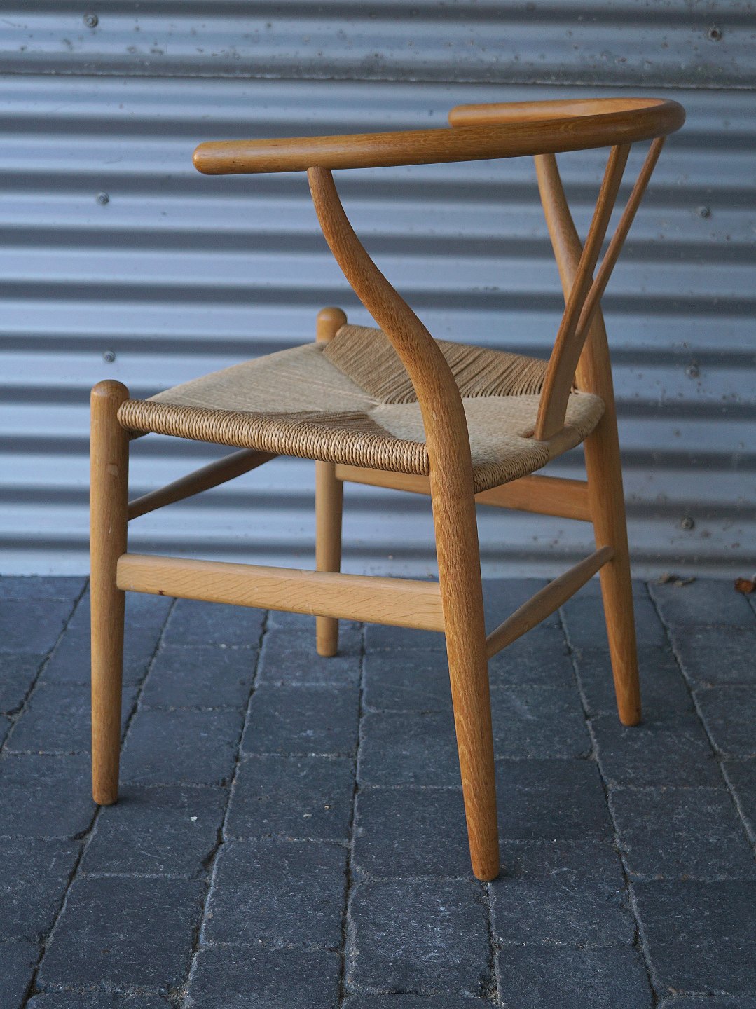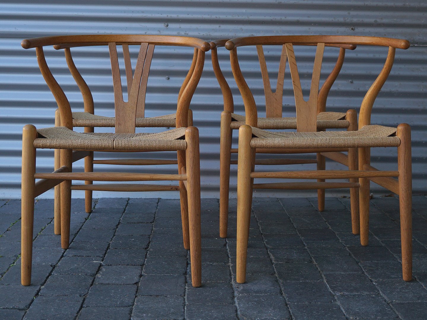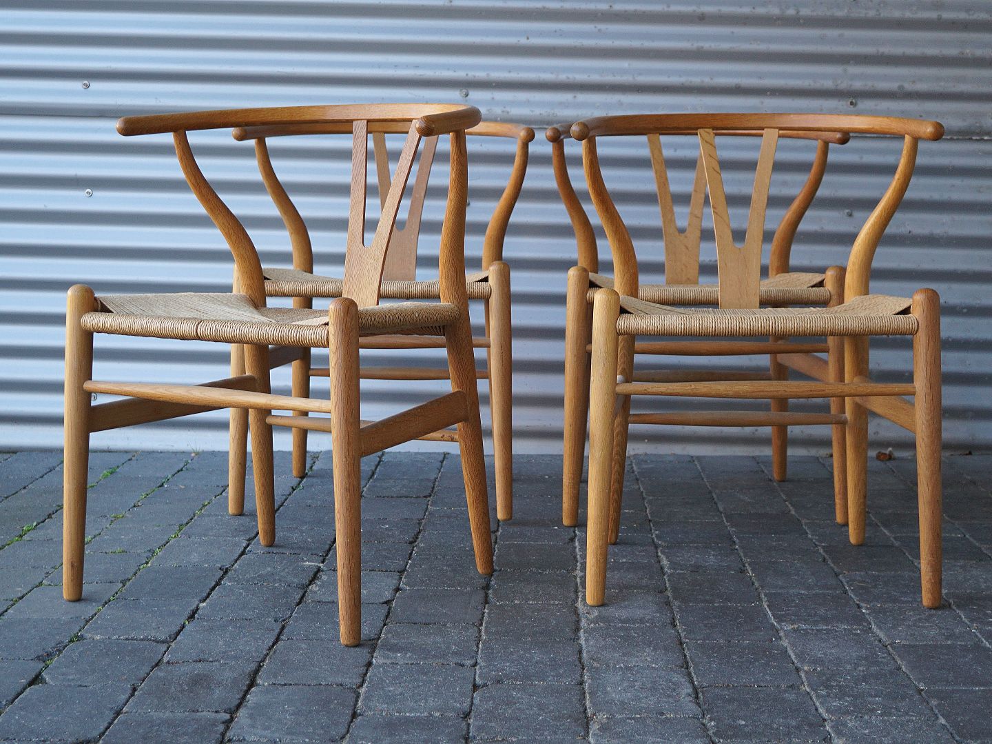 4 stk Hans Jørgen Wegner. CH24 eller Y-stolen, stolen er i eg og designet i 1949. Ryg og armlæn er et stykke træ, der er dampbøjet, sædet er betrukket med ca. 120 m papirgarn