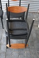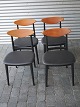 4 stole med teaktræsryg og sort nylakeret stel, sædet er nybetrukket med læder.