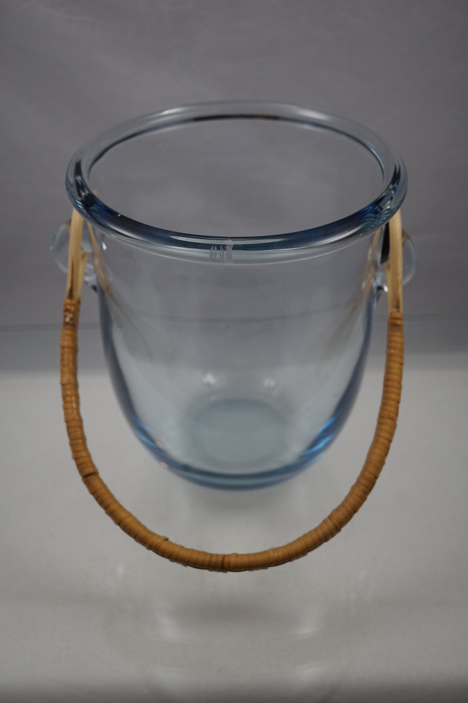 Holmegaard Glasværk, Champagnekøler, i lyst blålig glas og original bast hank. Champagnekøleren er mundblæst med påsatte hanke og udadbuet kant
