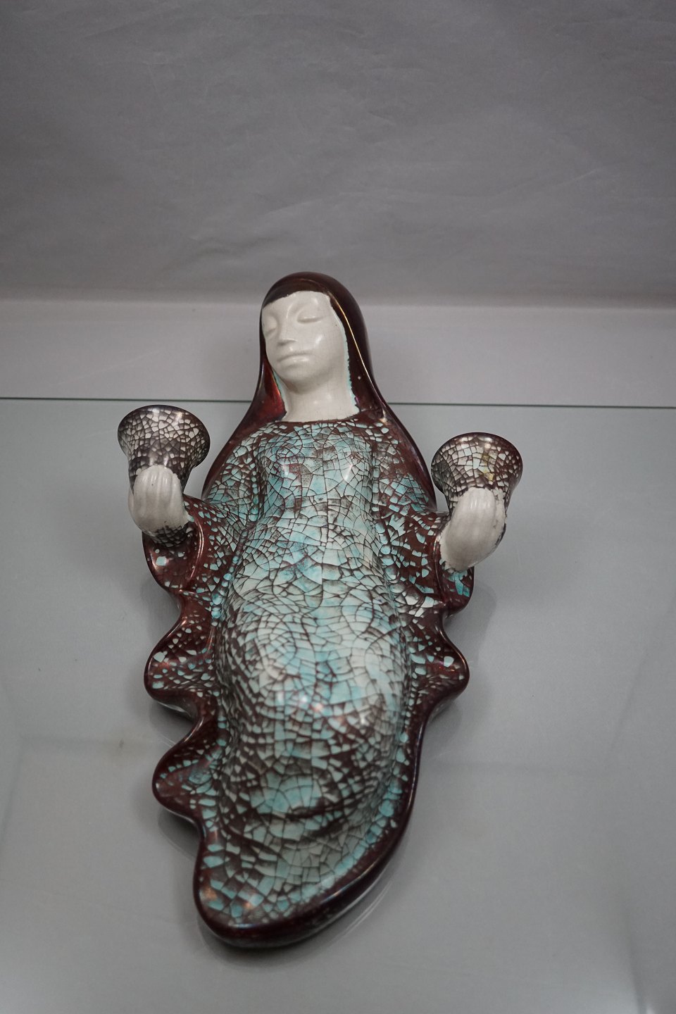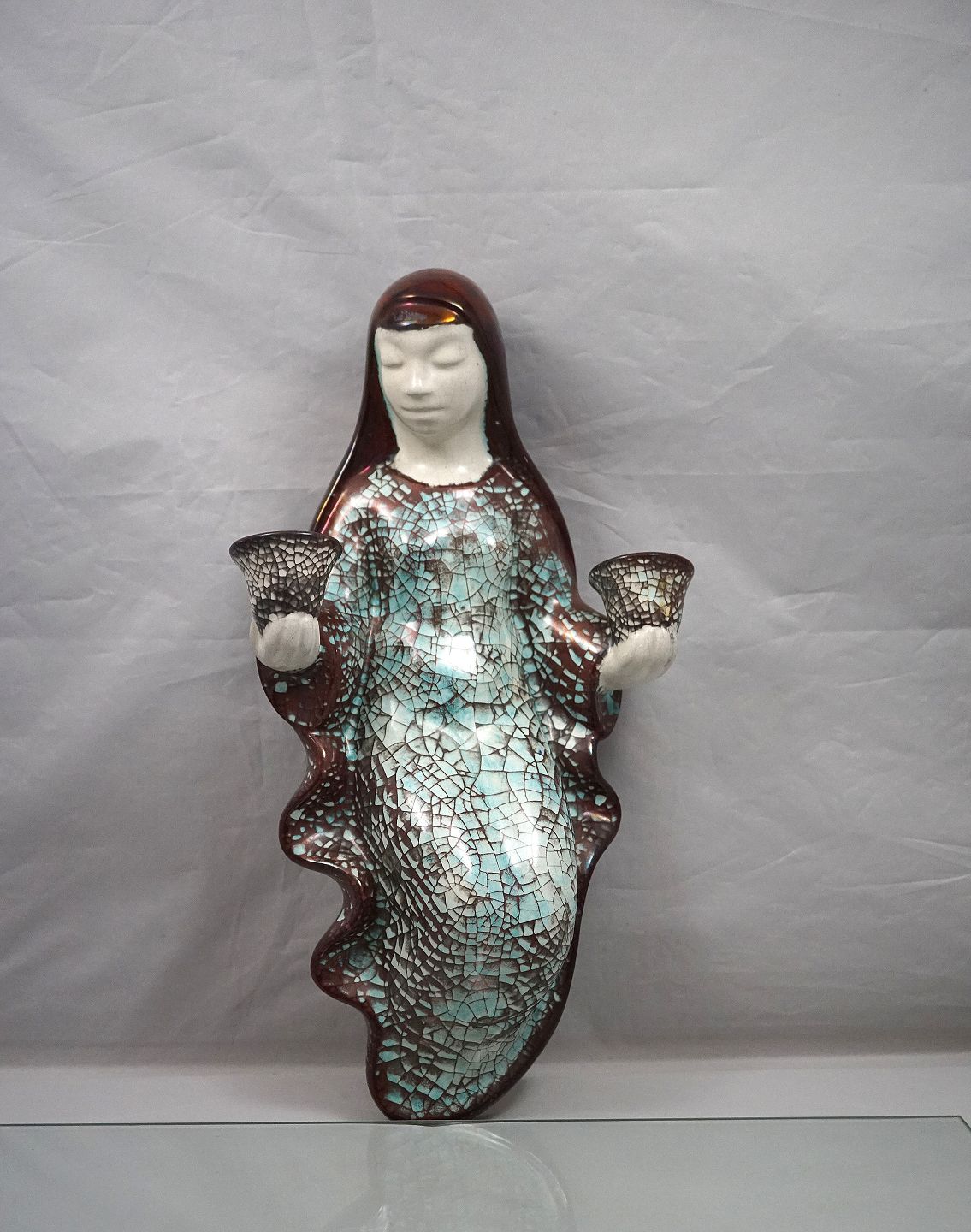 Madonna vægstage, nr 3829, fra Michael Andersens, Bornholm. Vægstagen er til 2 lys og udført med krakelèglassur