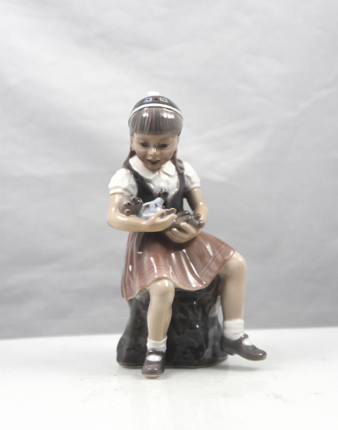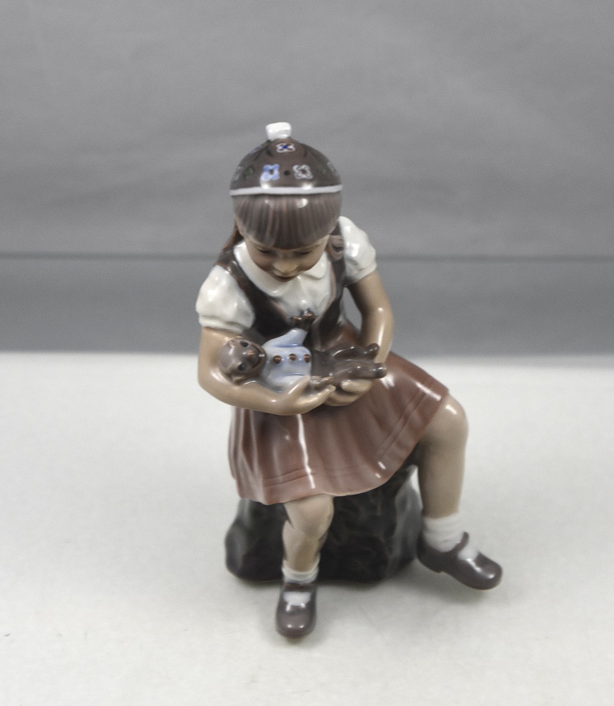 Figur i porcelæn med motiv af Pige, Bente, med dukke nr. 1295