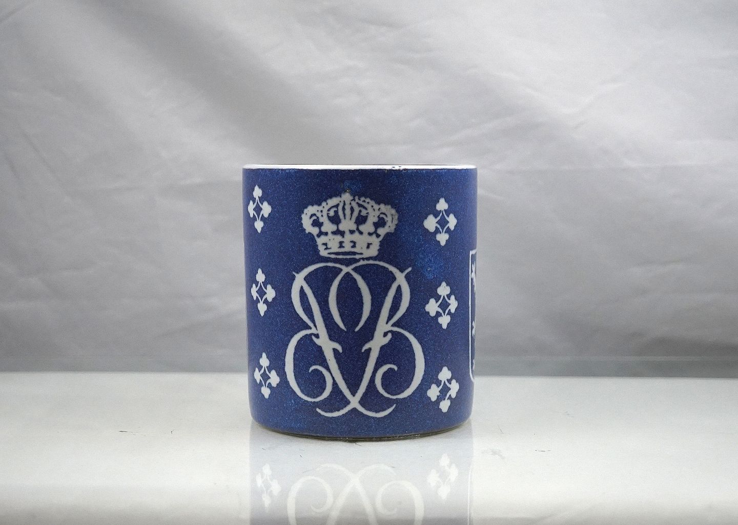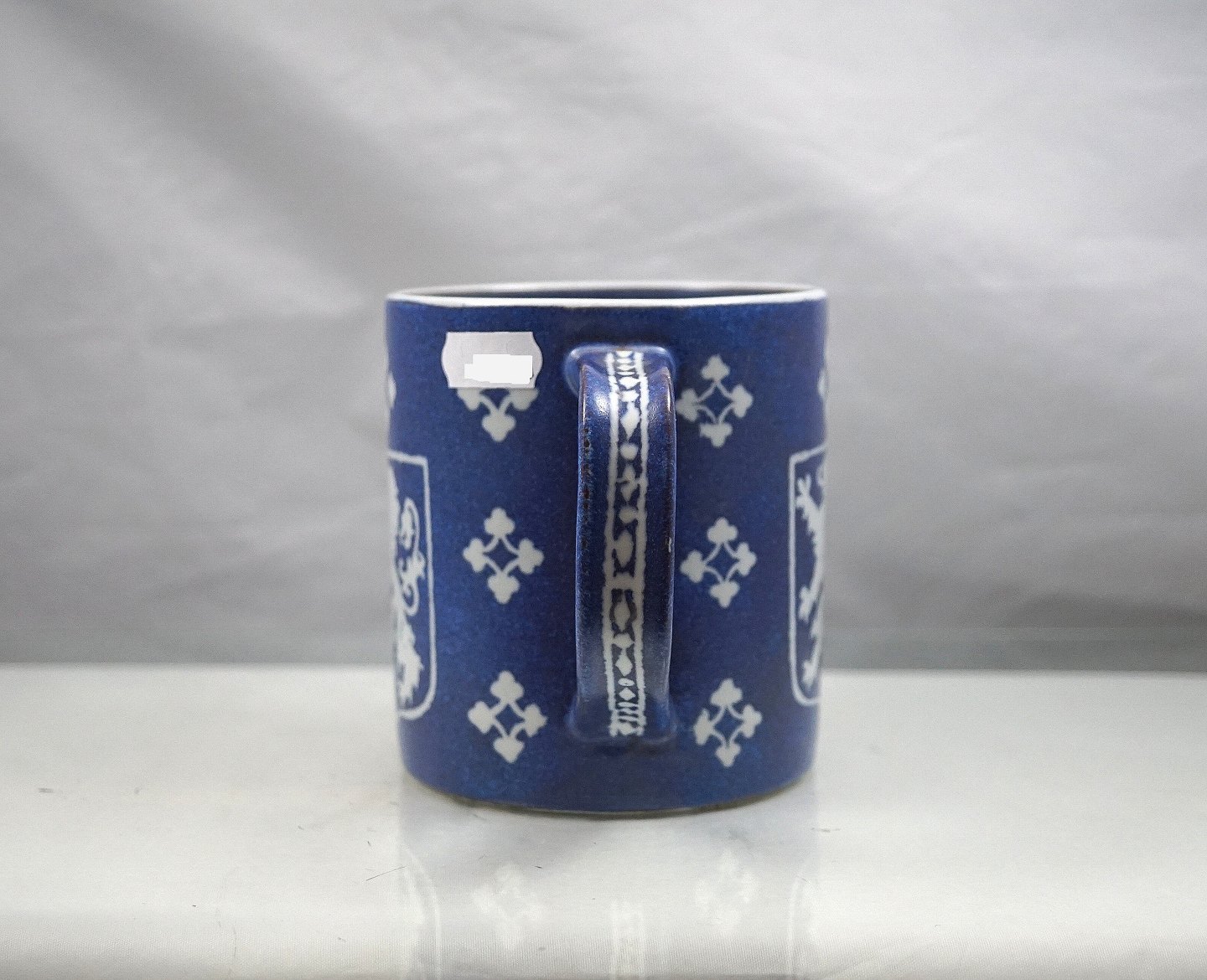 Aluminia. Krus, nr 740/3135. Kruset er blåt med hvidt monogram