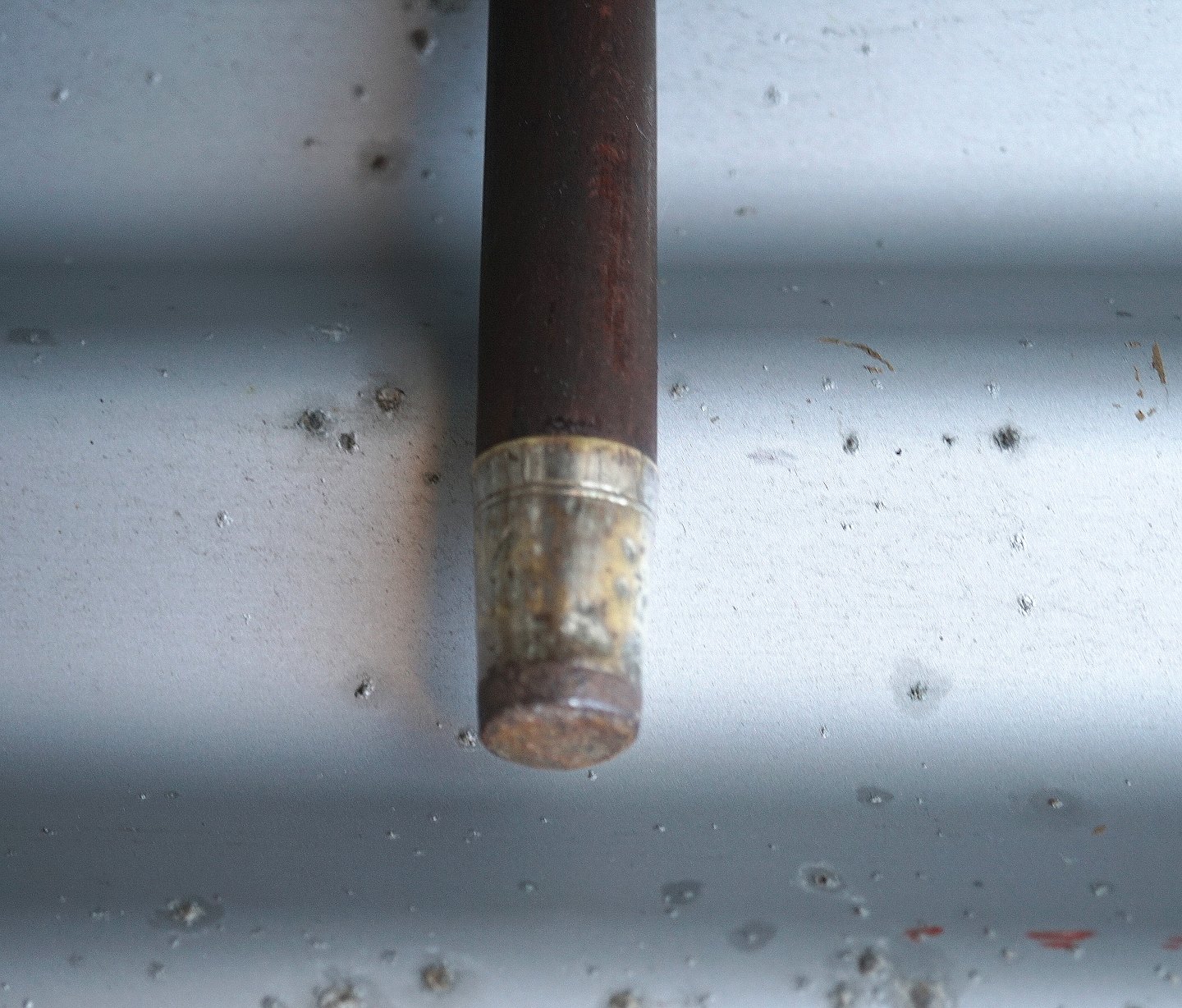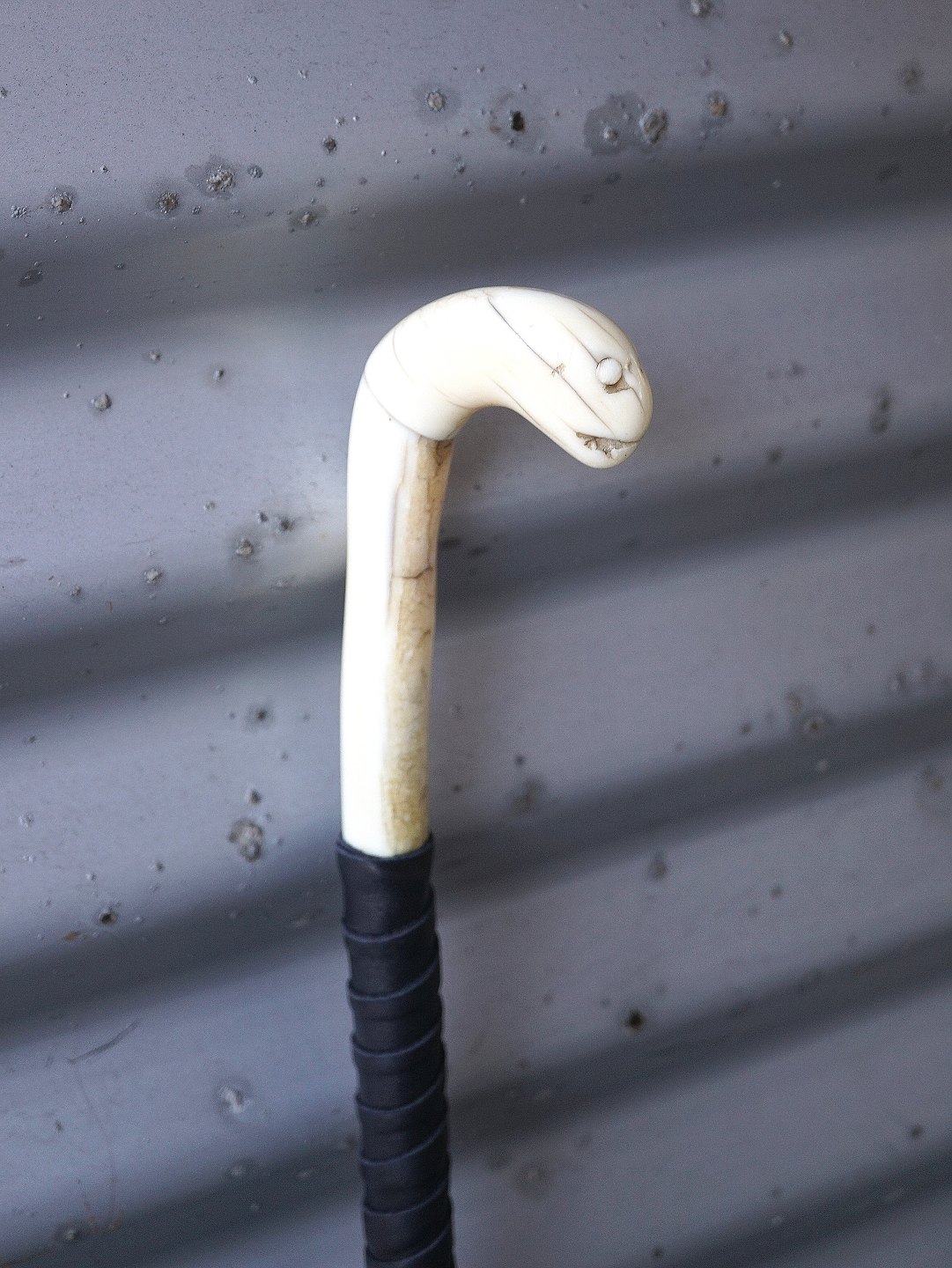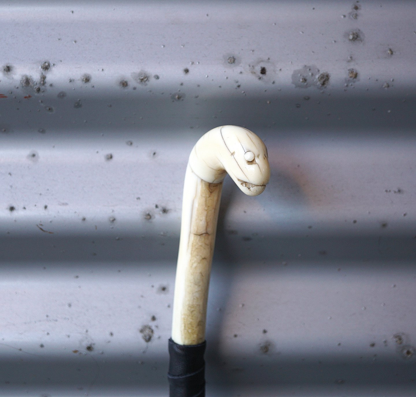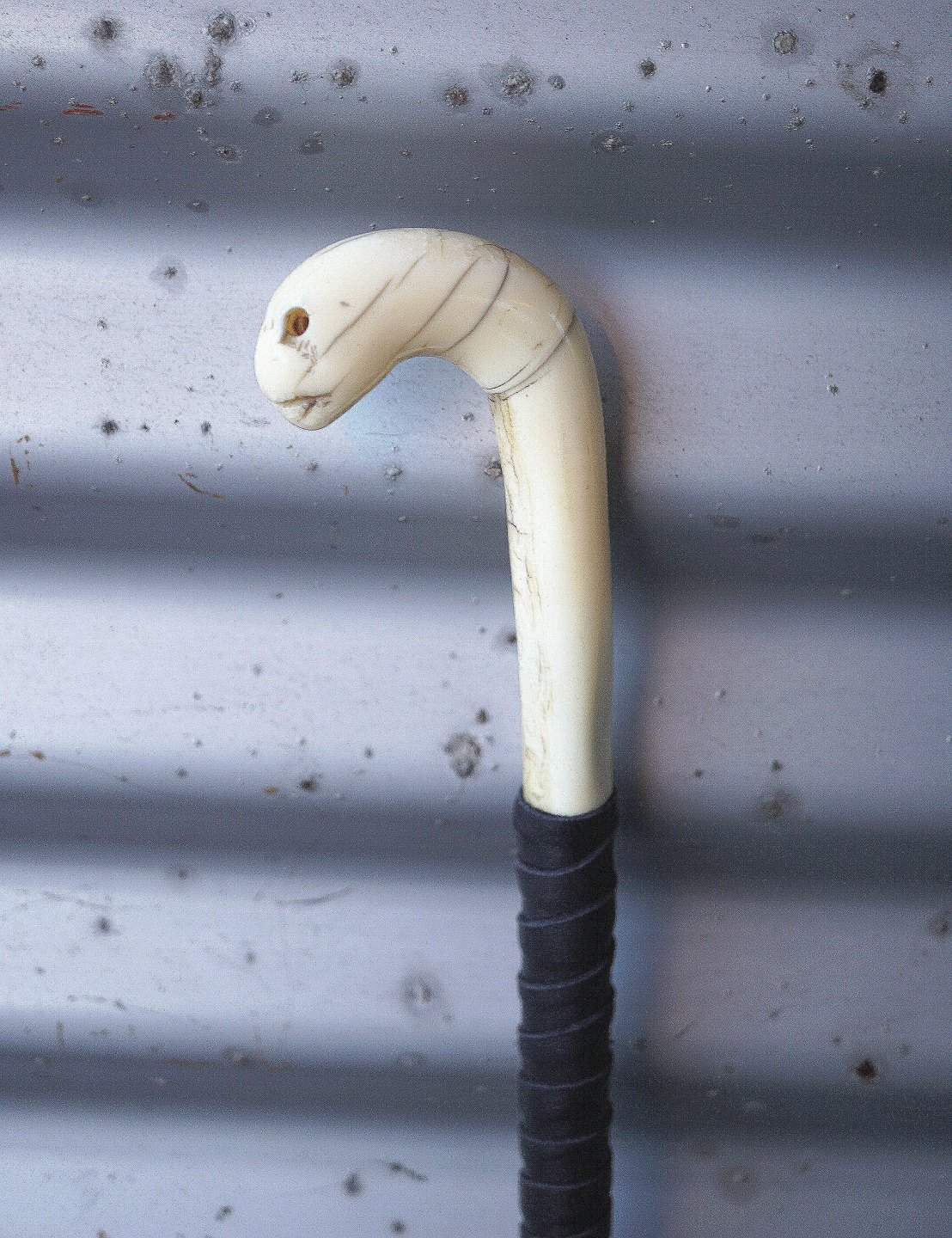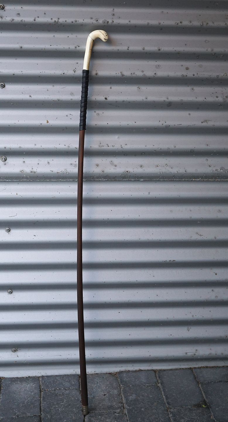Vandrestav med udskåret elfenben håndtag. Håndtaget ligner et slangehoved, der dog har mistet det ene øje. Forneden er der sat en dup på, men der er brugsspor på duppen