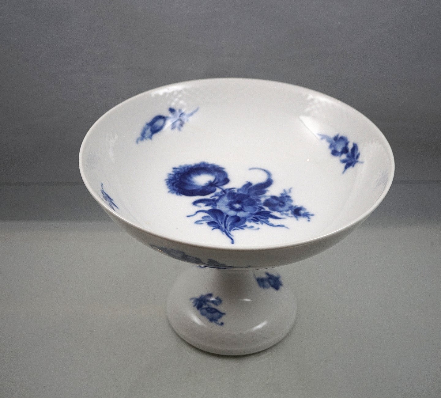 Royal Copenhagen. Blå blomst, nr 10/8064. Blå blomst, høj opsats med flettet kant. 1. sortering. Hver eneste buket er sammensat af maleren selv, efter plancher fra 1700-tallet. Royal Copenhagen begyndte at producere Blå Blomst i 1799, det blev stel nr 10. Produktionen ophørte i 2000