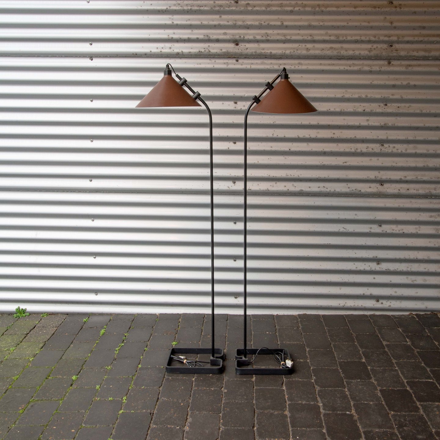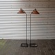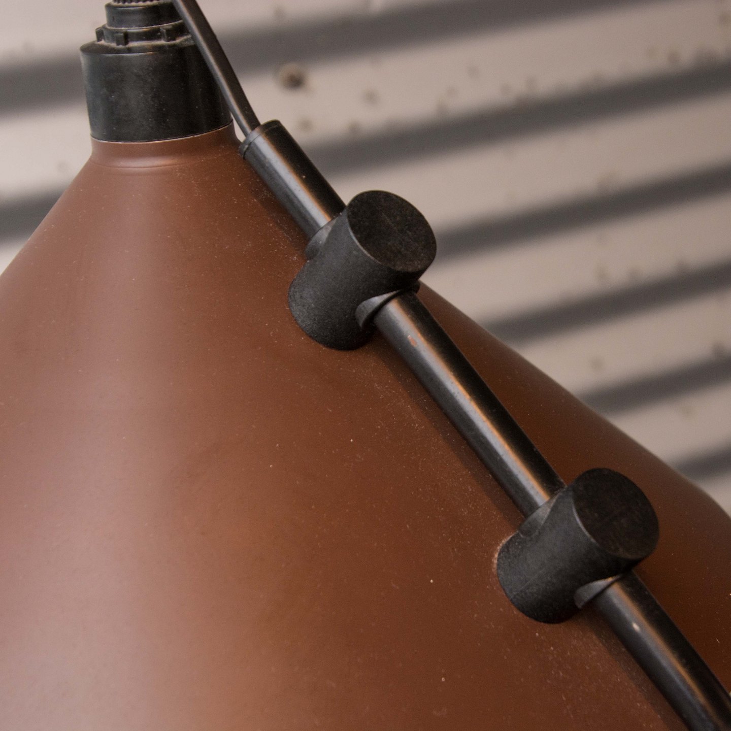 Brunlakeret aluminiumskærm på sortlakeret metalfod. Lamperne tændes i toppen.