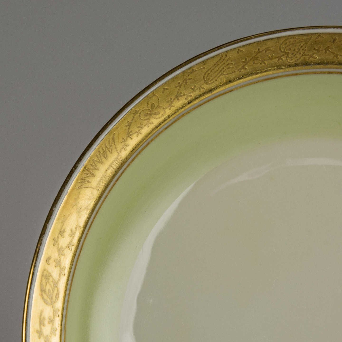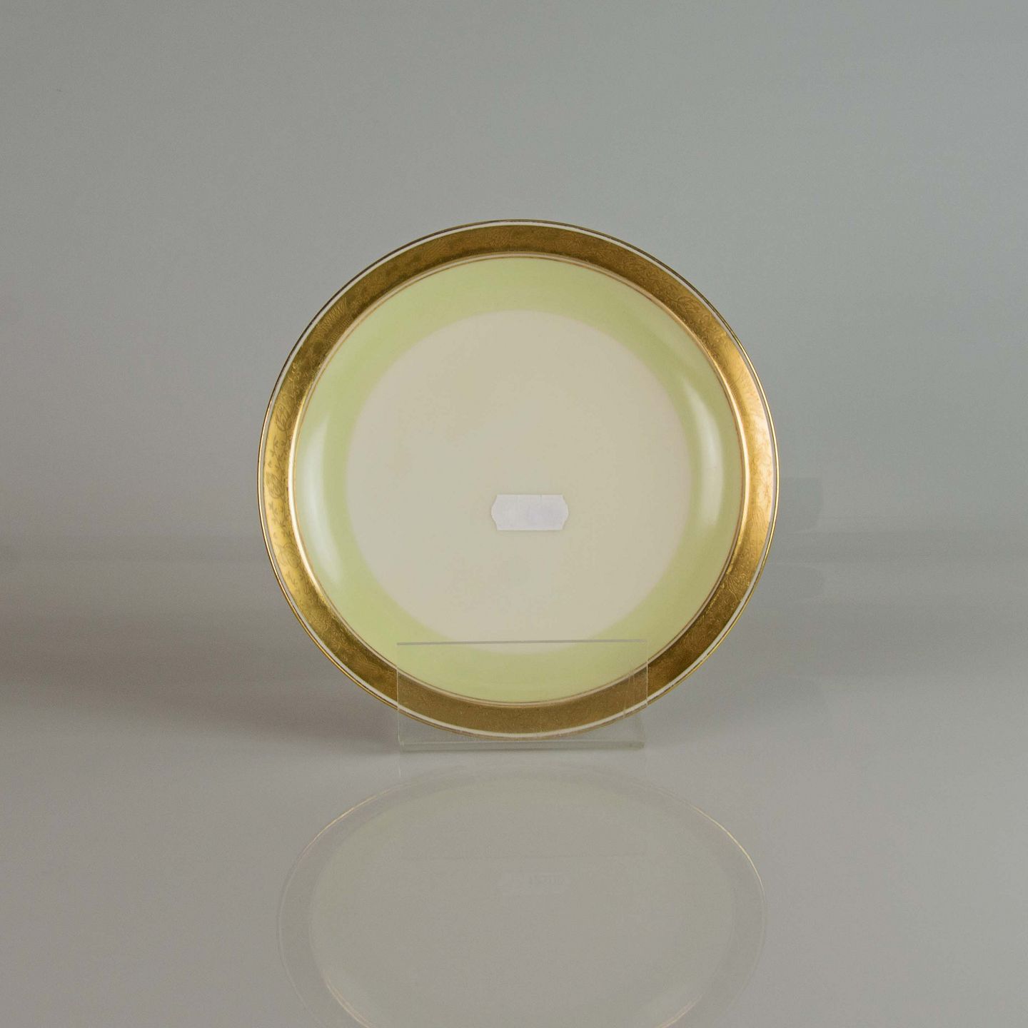 Tallerken i lys grøn og hvid porcelæn med gylden bort med motiv af krone og plantemotiver.