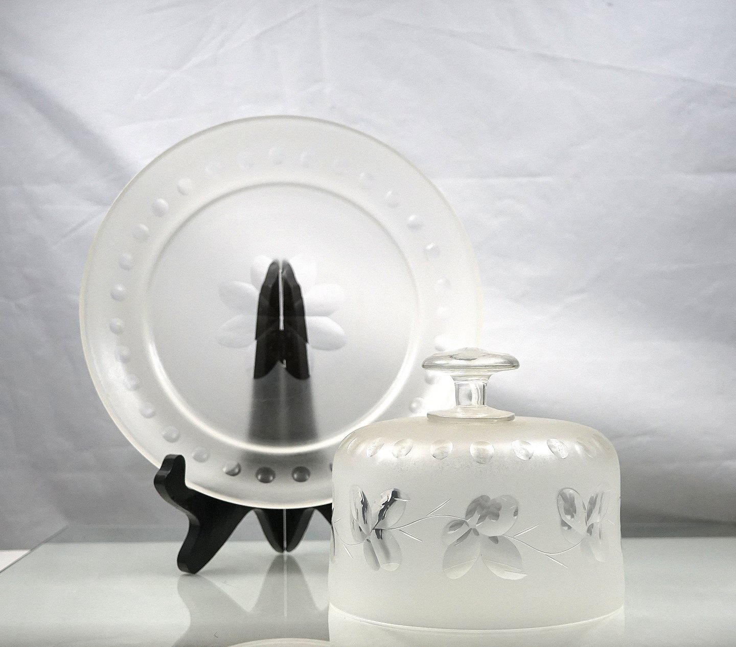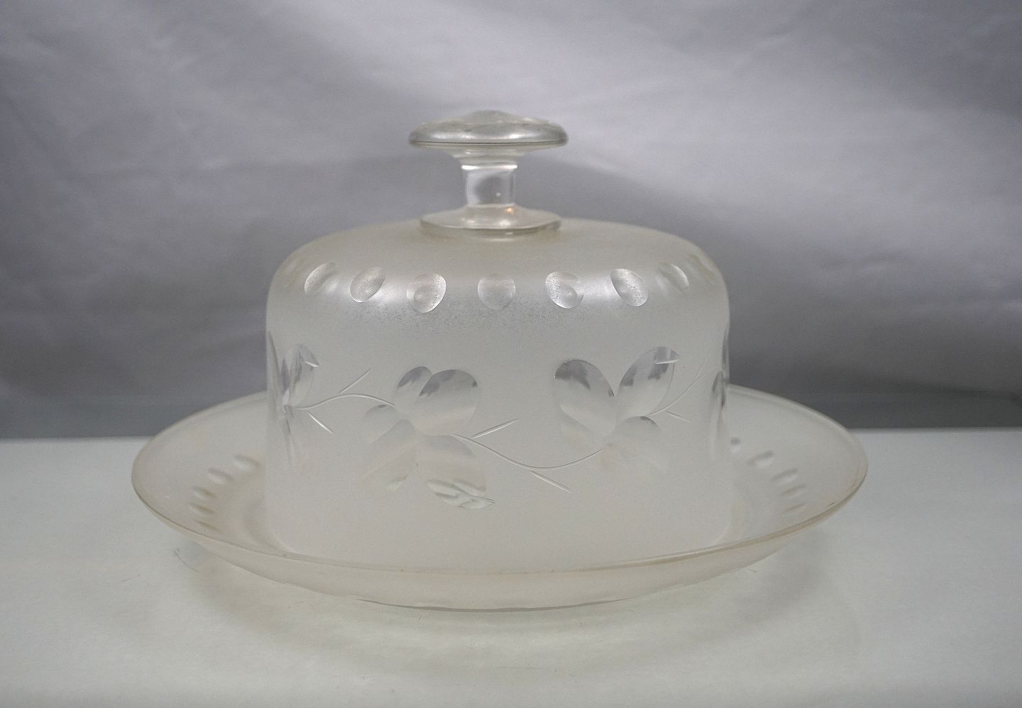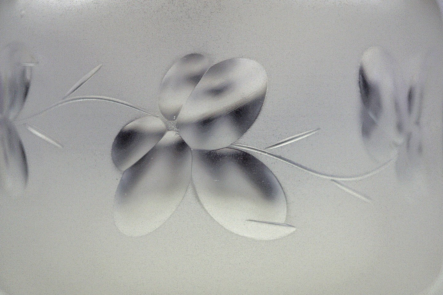 Osteklokke med blade der ,nok, er sandblæste eller ætset i glasset.