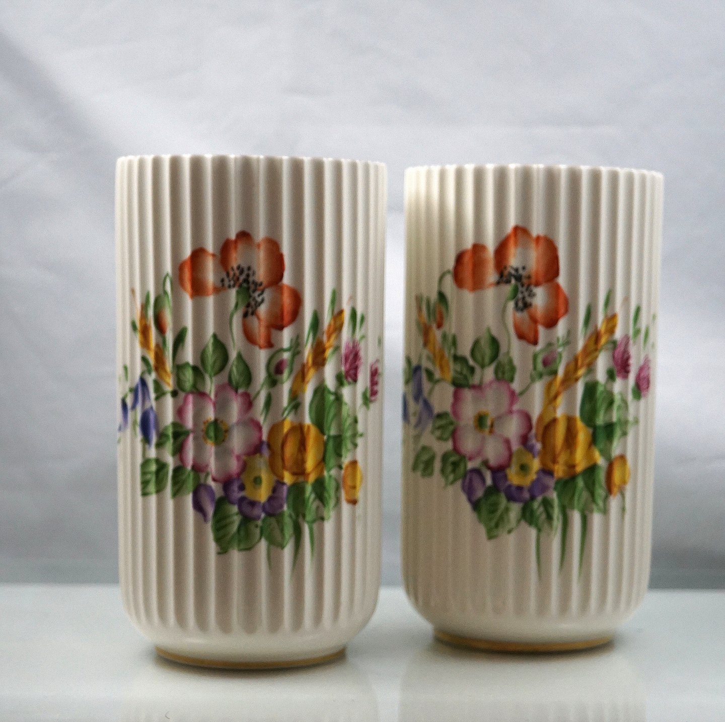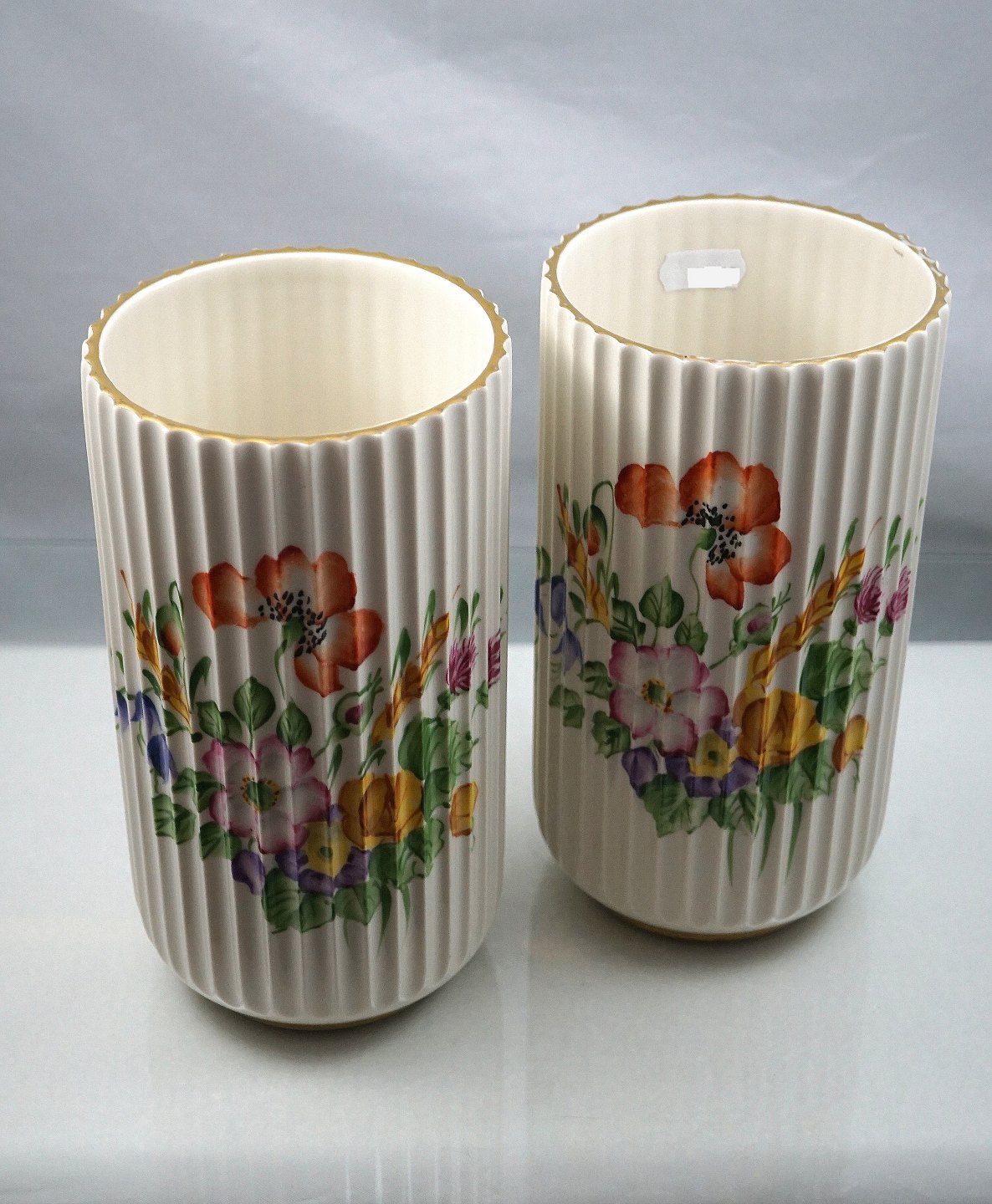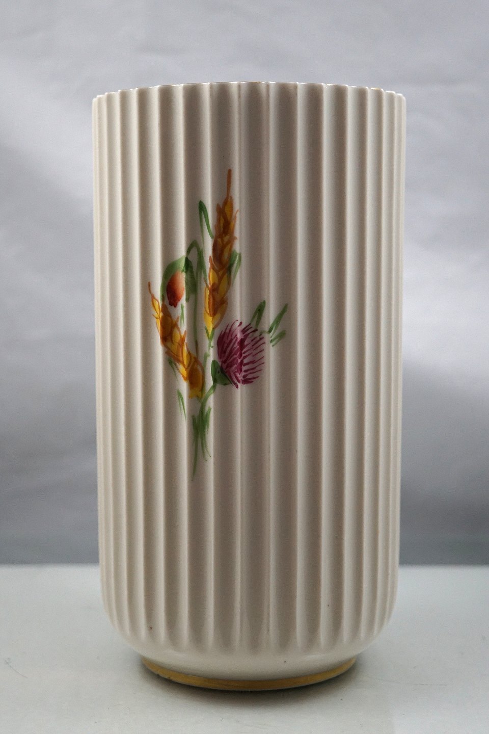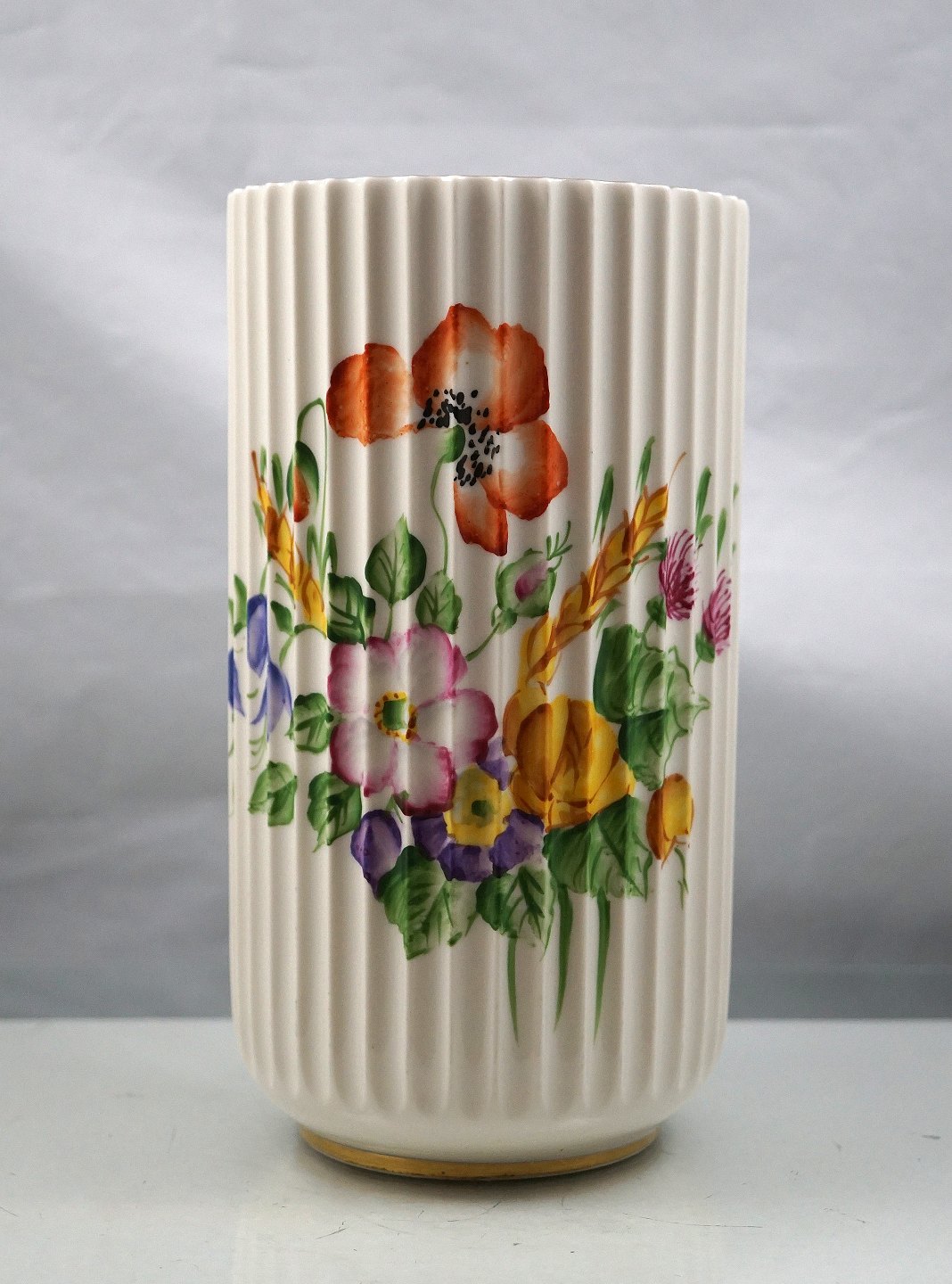 Lyngby , cremefarvet riflet vase, med blomster dekorationer og guldkant, nr. 4020. Vasen er 1. sortering