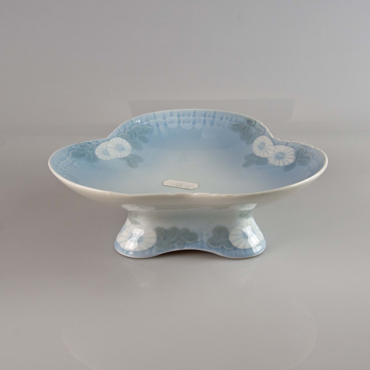 Fad på fod i hvid og lyseblå porcelæn med dekoration af margueritblomster og kløverblade