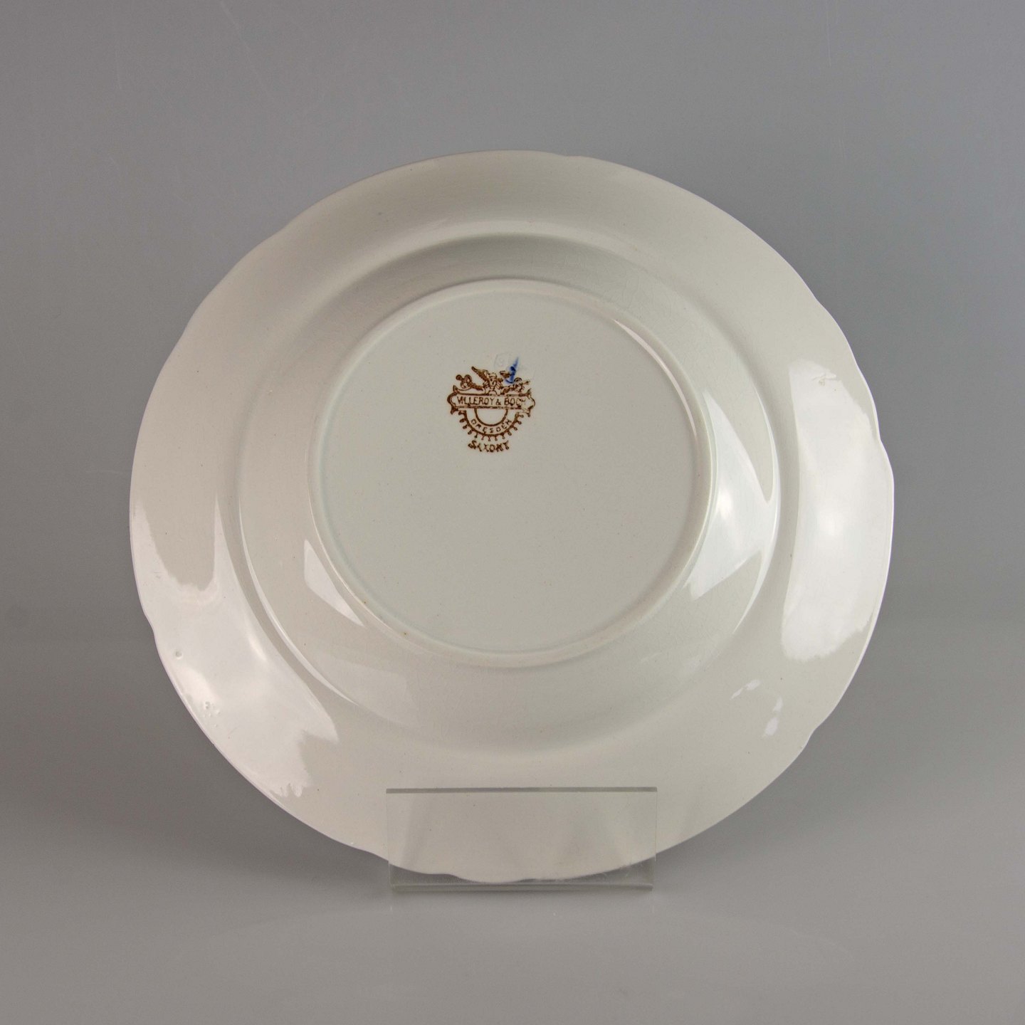 Tallerken i hvid fajance med dekoration af blå abstrakt mønster langs kanten.
