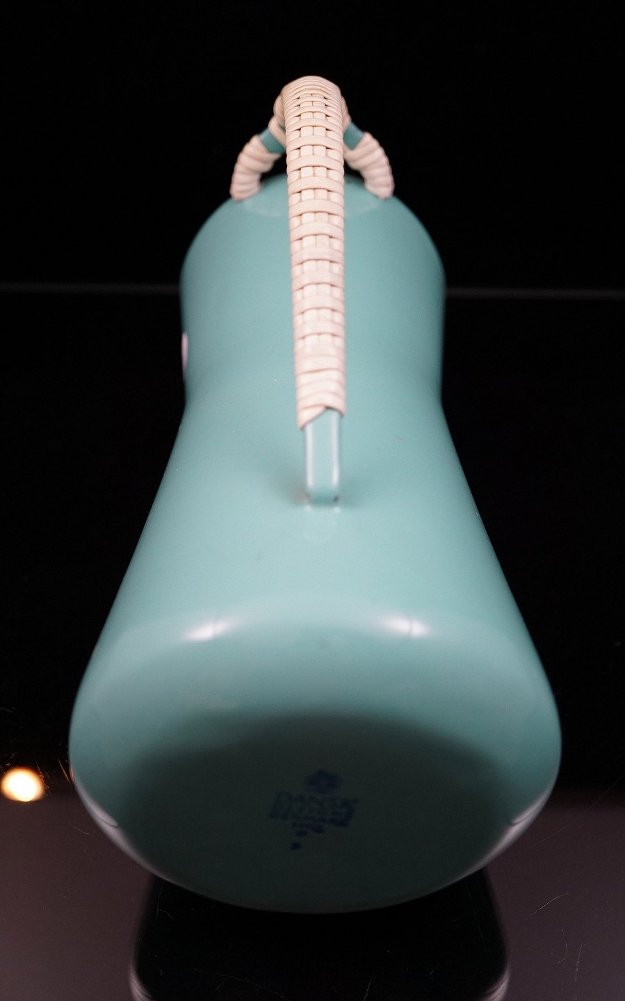 Kande i turkis og hvid emalje med plastflet på hank