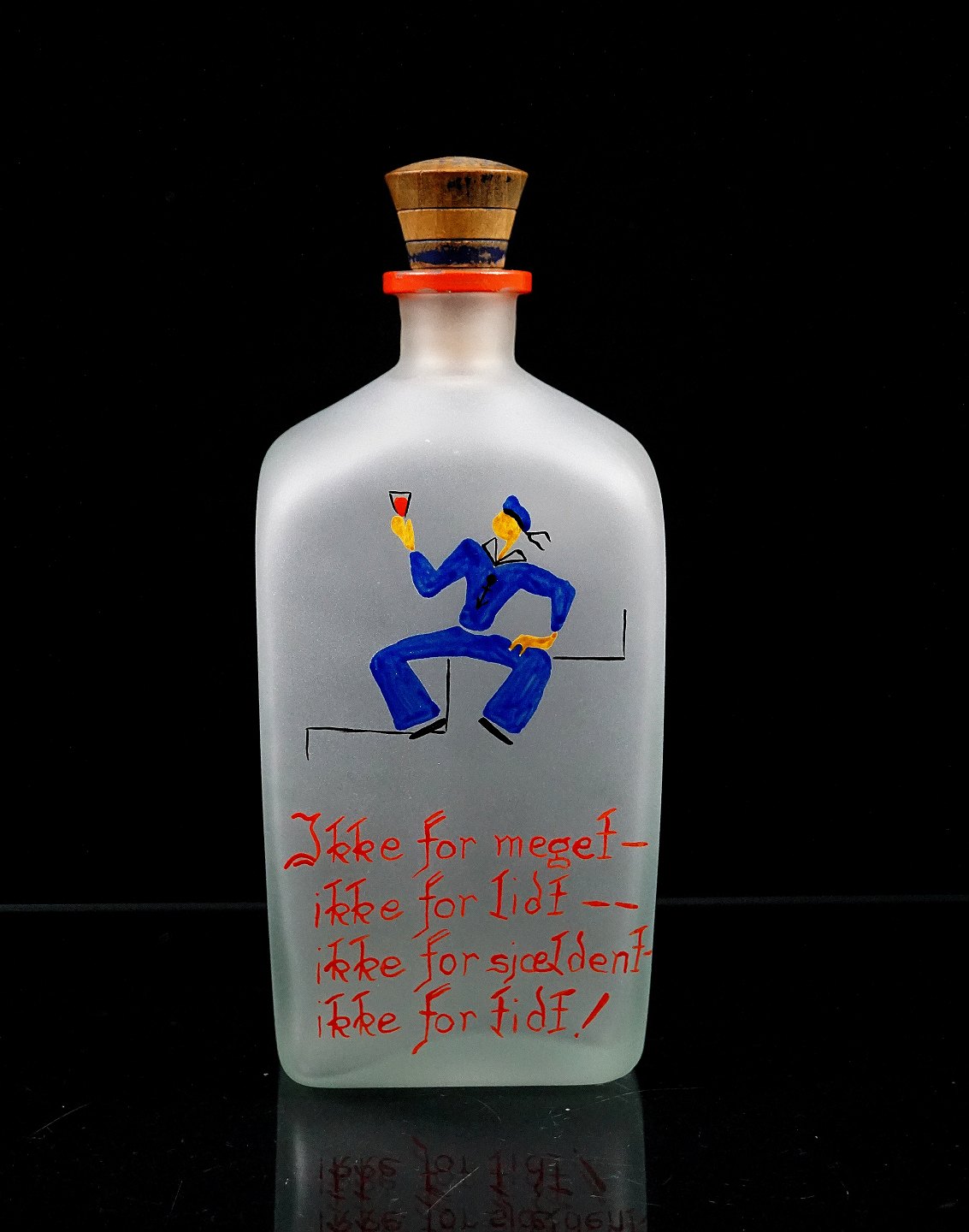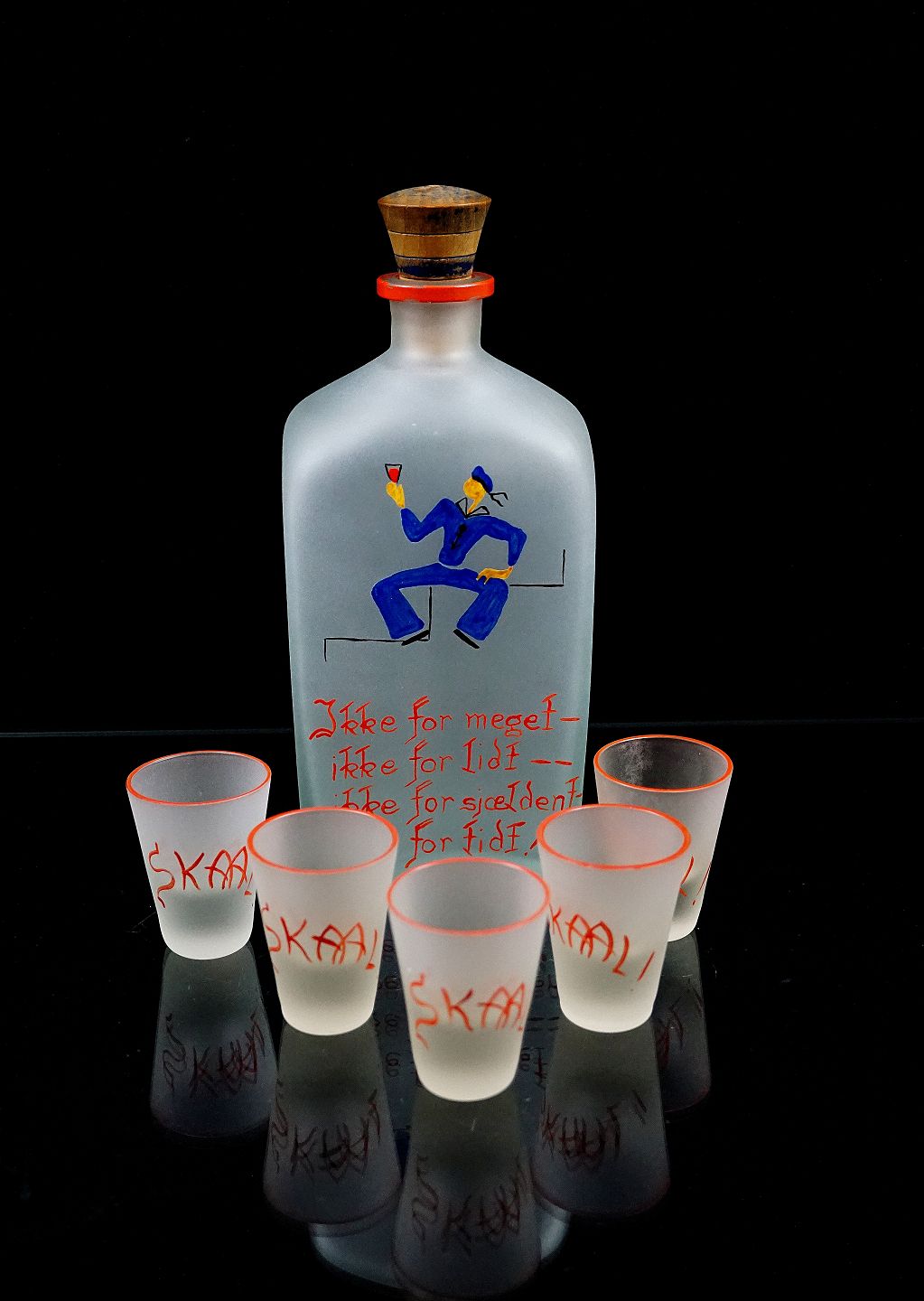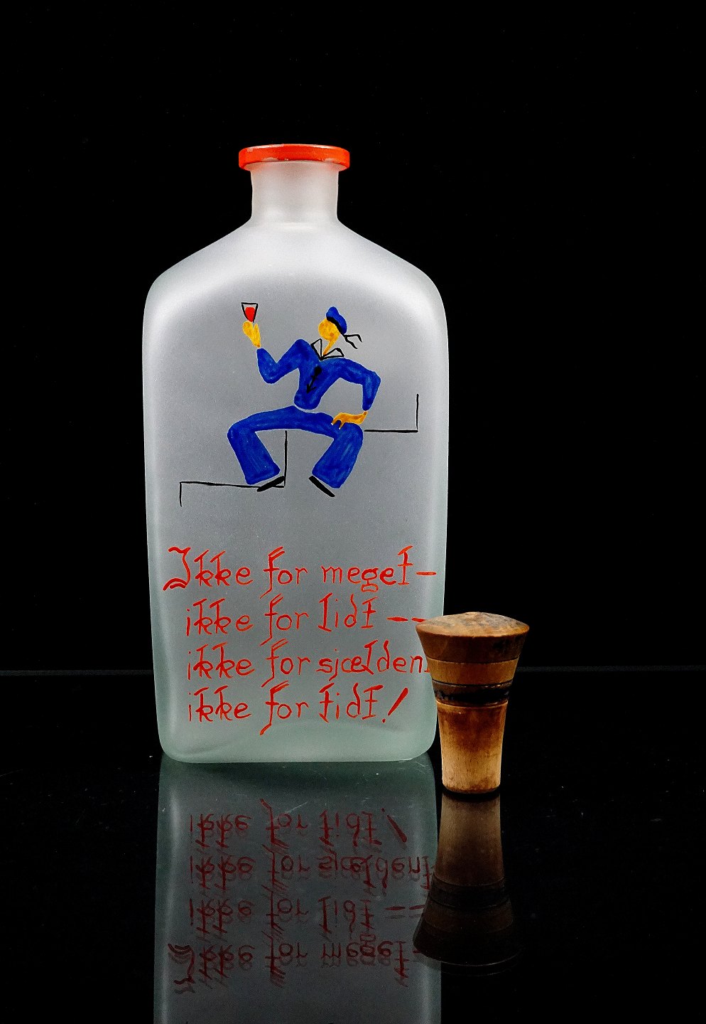 Holmegaard Glasværk. 4-kantet snapsekaraffel med 5 snapseglas. Karaflen er af mat, hvidt glas. Der er lavet en, emaljeret, glad sømand, siddende på en trappe på forsiden.