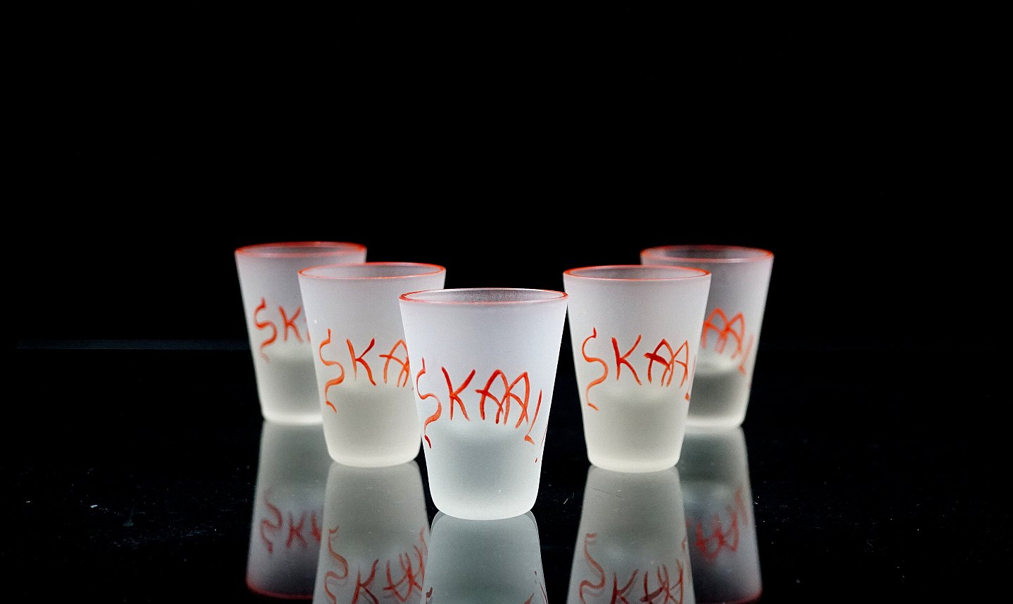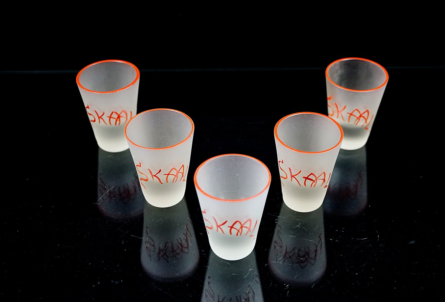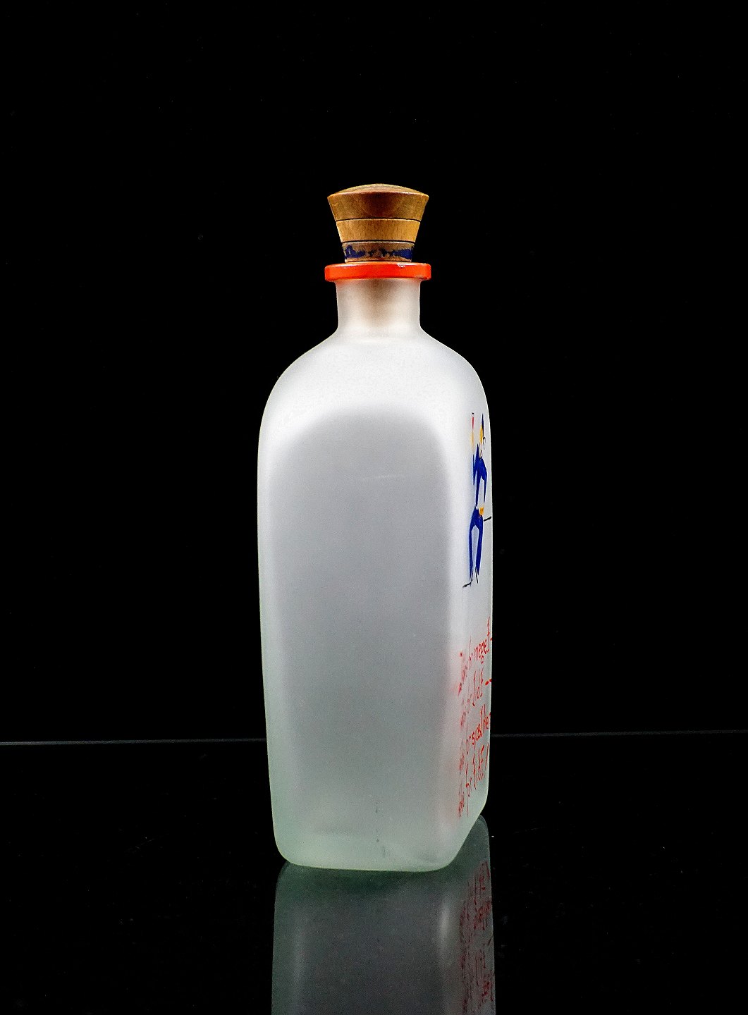 Holmegaard Glasværk. 4-kantet snapsekaraffel med 5 snapseglas. Karaflen er af mat, hvidt glas. Der er lavet en, emaljeret, glad sømand, siddende på en trappe på forsiden.