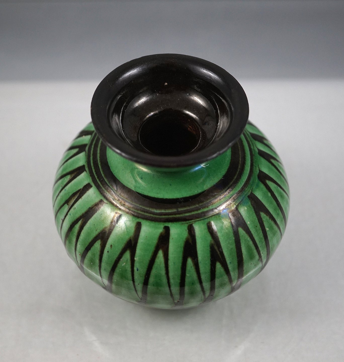 Kähler vase. Lille grøn vase med sorte striber, vasen er sort indvendig